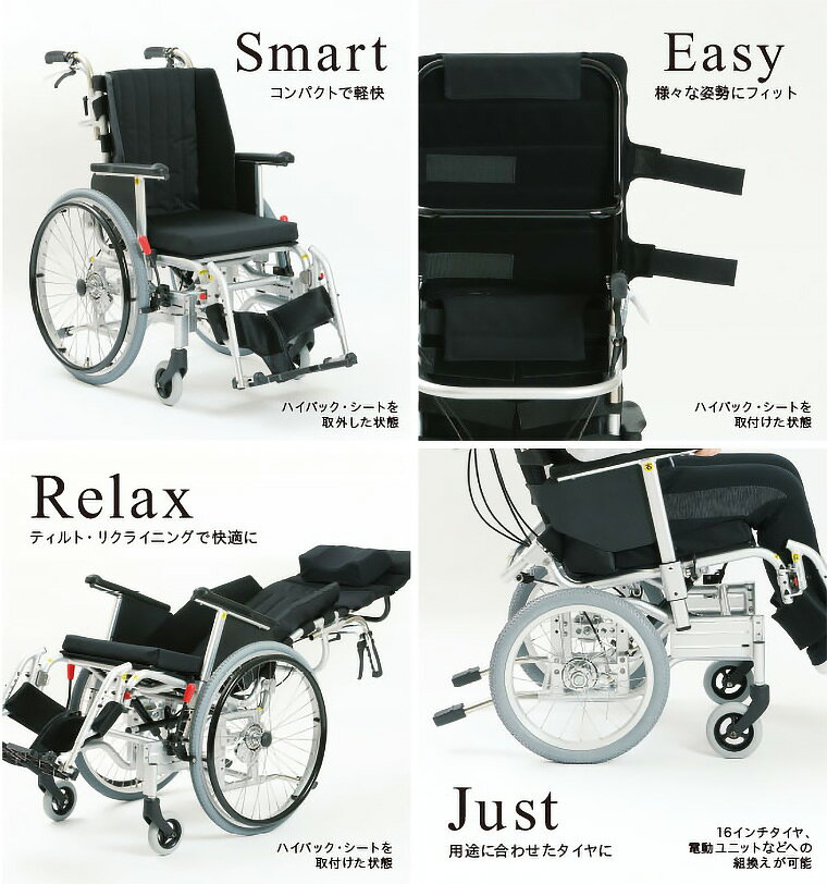 ●サイズ/全幅63×全長96×全高90cm、座面:幅40×奥行38.5cm、前座高:40cm●車輪サイズ/前輪5×後輪22インチ●重さ/21.5kg●材質/アルミ●最大使用者体重/100kg●標準機能/折りたたみ、ティルト角度(-2〜18.5°)、リクライニング(90〜135°)、ハイバックシート、フット・レッグサポート、介助用ハンドル、左右独立背張り調節、タイヤ車軸位置調節●原産国/中国・基本を押さえたモジュラー式。漕げるティルト・リクライニング車いす。・移動から休息まで、毎日を快適に過ごせる利用者にも介助者にも配慮した設計。・長時間でも疲れない座り心地と身体がズレない安定したシーティングシステム。【カルバオン】