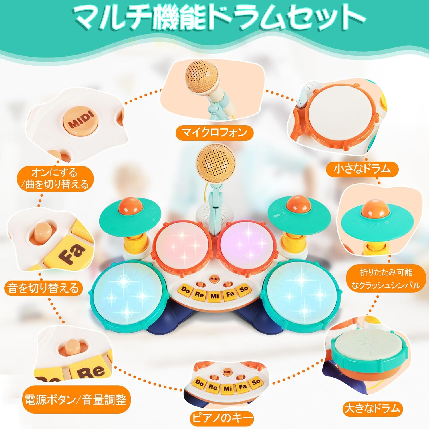 楽器 おもちゃ 6in1ドラムセット子供 マイク付き 音楽おもちゃ 子供おもちゃ人気 多機能 ピアノ 楽器玩具 赤ちゃん おもちゃ 人気ランキング、ピアノモード ドラムモード 鍵盤楽器 おもちゃ 赤ちゃん ドラムセット ライト効果 多機能 知育玩具 (バッテリー別売り)