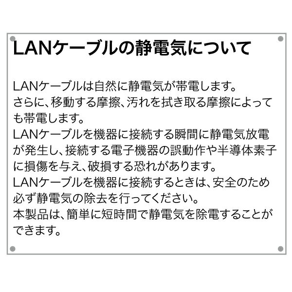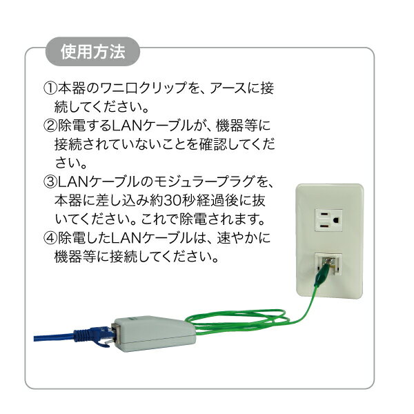LANケーブルに帯電した静電気を除去●使用方法1本器のワニ口クリップを、アースに接続してください。2除電するLANケーブルが、機器等に接続されていないことを確認してください。3LANケーブルのモジュラープラグを、本器に差し込み約30秒経過後に抜いてください。これで除電されます。4除電したLANケーブルは、速やかに機器等に接続してください。●ケーブル長:約1m●サイズ:60×26×22.6mm(本体のみ)●質量:34g・梱包仕様 個装梱包:ヘッダー・ポリ袋 個装サイズ・質量:W120×D30×H180mm・40g・1個口・原産国:台湾