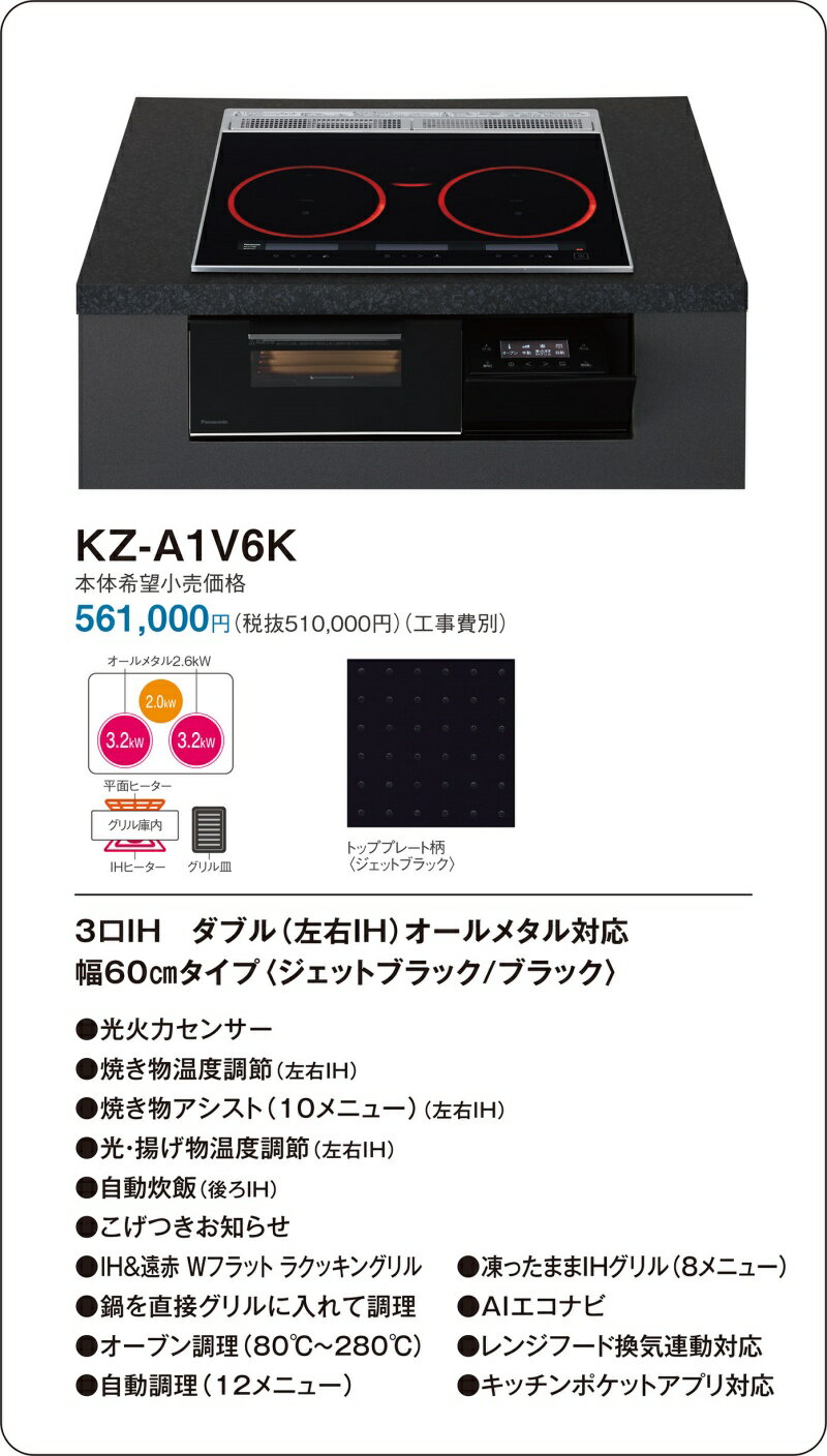 [法人限定] KZ-A1V6K パナソニック IHクッキングヒーター ビルトイン ジェットブラック/ブラック 60cm 3口IH ダブル(左右IH)オールメタル対応 [ KZA1V6K ]