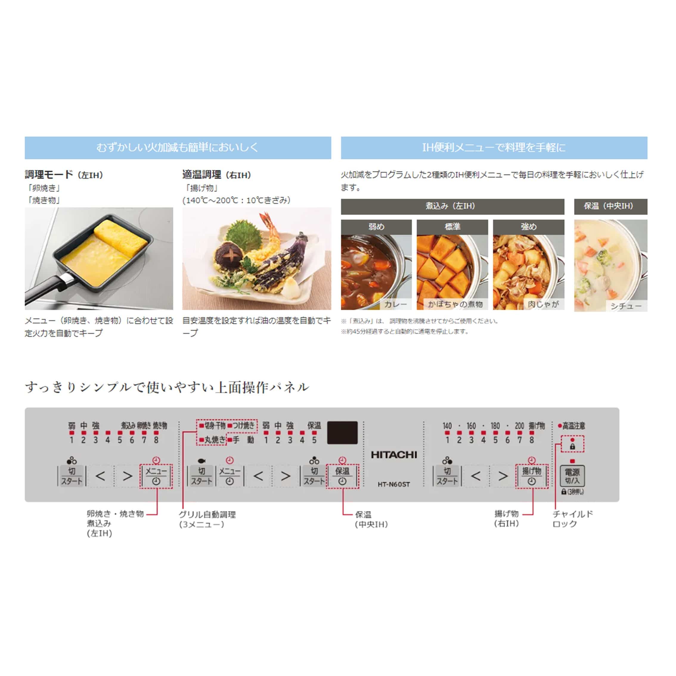 HT-N6KT(S)シルバー●サイズ外形寸法(幅×奥行×高さ)600×559×234mm(組込み高さ220mm)トッププレート幅:60cm重量:15.0kg●電圧、総消費電力:単相200V(50/60Hz)-5.8kW●火力調節左右IH100W相当〜3.0kW8段階:タッチキー式中央IH100W相当〜1.2kW5段階*1:タッチキー式*1 中央IHとグリルは同時使用できません。グリル手動270W〜700W相当3段階:タッチキー式●機能適温調理光・温度センサー●商品詳細はメーカーホームページ、カタログにてご確認ください。