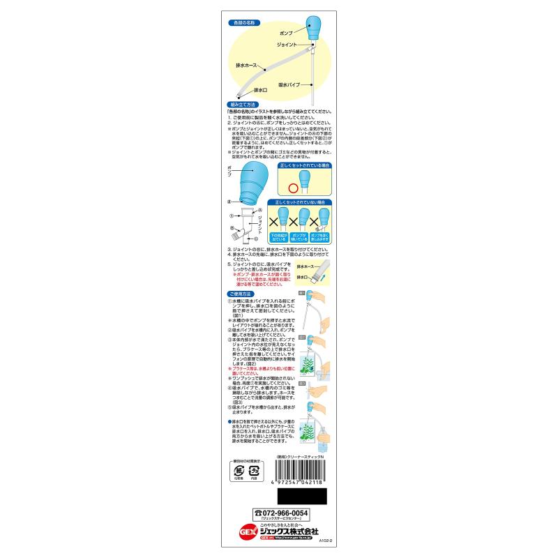 ジェックス GEX おそうじラクラク クリーナースティックNコンパクト水槽にピッタリのお手軽クリーナー。細い吸水パイプでレイアウトを崩さず水換えできる。ワンプッシュで簡単排水スタート。ゴミが舞わずに排水できるから水がにごらないレイアウトが汚れない流量調整できる「やわらかホース」採用。【適合水槽】コンパクト水槽用。水深約27cmまで。