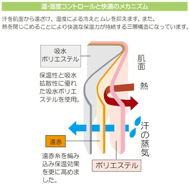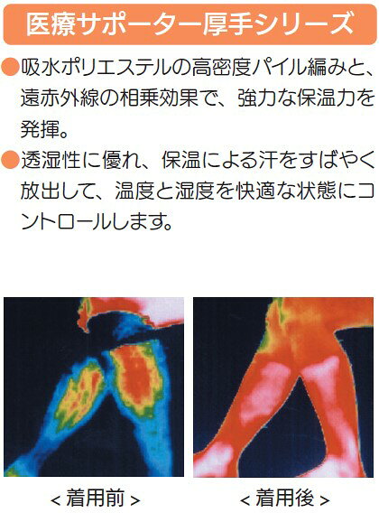 ・吸水ポリエステルの高密度パイル編みと、遠赤外線の相乗効果で、強力な保温力を発揮。 ・透湿性に優れ、保温による汗をすばやく放出して、温度と湿度を快適な状態にコントロールします。 汗を肌面から遠ざけ、湿度による冷えとムレを抑えます。また、熱を閉じ込めることにより快適な保温力が持続する三層構造になっています。 品質表示 ポリエステル・吸水ポリエステル・遠赤ポリエステル・アクリル・ポリウレタン・ウール 原産国 日本 【サイズ】 Mサイズ 22.0〜29.0 cm JAN 4955574786125 Lサイズ 27.0〜35.0 cm JAN 4955574786132 LLサイズ 34.0〜46.0 cm JAN 4955574786149 ※ひざの周りを計測してください。