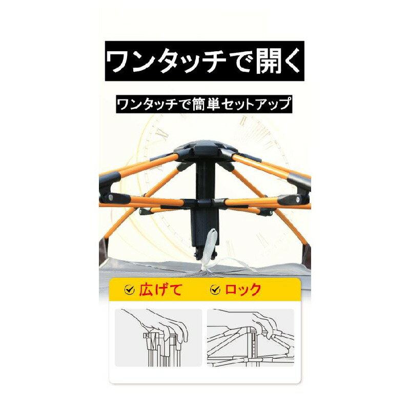 テントを持って、アウトドアの世界にでかけよう!!楽しいこと、美味しいもの、いっぱいあなたを待っています【UVカット】UPF50+のUVカット生地を使用しました。紫外線から大切なお肌を守ります。商品仕様サイズ重量耐水圧2扉2窓【1-2人用】:約200*150*135CM、約2.kg「耐水圧:約2000」2扉2窓【3-4人用】:約220*200*145CM、約3kg「耐水圧:約2000」2扉0窓【1-2人用】:約200*150*135CM、約2.3kg「耐水圧:約2000」2扉0窓【3-4人用】:約220*200*145CM、約3kg「耐水圧:約2000」1扉1窓【1-2人用】:約200*150*135CM、約1.7kg「耐水圧:約1000」1扉1窓【3-4人用】:約220*200*145CM、約2kg「耐水圧:約1000」新モデル【4-6人用】:約220*220*150CM、約3.3kg「耐水圧:約2000」素材本体:ポリエステルフレーム:グラスファイバーUV保護指数:UPF50+使い方:1.キャリーバッグからテント本体を取り出して、テントのフレーム4本を外側に広げます。2.テントの頂点部分を引き上げます。3.フレームの屈伸部分が完全に伸びている事を確認してください。人気商品をお勧めテントを持って、アウトドアの世界にでかけよう!!楽しいこと、美味しいもの、いっぱいあなたを待っています【UVカット】UPF50+のUVカット生地を使用しました。紫外線から大切なお肌を守ります。商品仕様サイズ重量耐水圧2扉2窓【1-2人用】:約200*150*135CM、約2.kg「耐水圧:約2000」2扉2窓【3-4人用】:約220*200*145CM、約3kg「耐水圧:約2000」2扉0窓【1-2人用】:約200*150*135CM、約2.3kg「耐水圧:約2000」2扉0窓【3-4人用】:約220*200*145CM、約3kg「耐水圧:約2000」1扉1窓【1-2人用】:約200*150*135CM、約1.7kg「耐水圧:約1000」1扉1窓【3-4人用】:約220*200*145CM、約2kg「耐水圧:約1000」新モデル【4-6人用】:約220*220*150CM、約3.3kg「耐水圧:約2000」素材本体:ポリエステルフレーム:グラスファイバーUV保護指数:UPF50+使い方:1.キャリーバッグからテント本体を取り出して、テントのフレーム4本を外側に広げます。2.テントの頂点部分を引き上げます。3.フレームの屈伸部分が完全に伸びている事を確認してください。人気商品をお勧め