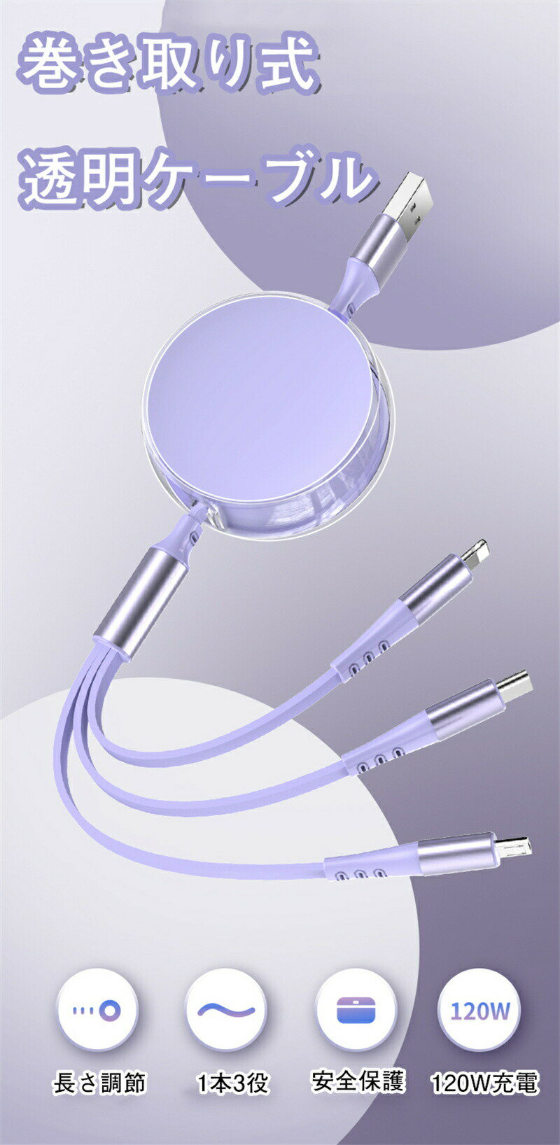 3in1 充電 ケーブル 透明ケーブル 6A急速 高品質 6A 急速充電 マルチ充電ケーブル iPhoneケーブル microUSB type-c マルチケーブル アンドロイド ライトニングケーブル アイフォンケーブル タイプc マイクロusb 充電器 usbケーブル 5段階収納 巻き取り 透明