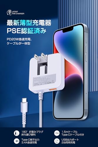 ホワイト/-/JX-AC-187G・Color:ホワイト・▼進化版type-c充電器USB充電器 Type-C PD 20W 急速充電器は、USB-Cケーブルが一体化されている充電器なので、ケーブルを持ち運ぶ必要がありません。進化版は耐久性が優れたナイロン編みケーブルを採用しているので、ナイロンファイバーで断線しにくい、一般的なUSBケーブルより寿命を数倍に向上します。・▼PD20W&QC3.0急速充電携帯充電器はUSB Type-CケーブルとUSB-Aポートの合計2つ出力を搭載します。単独一つ出力で充電する場合場合、Power Delivery(PD)対応USB-Cケーブルは、最大PD20Wの高出力による急速充電します。iPhone15を約30分で50%まで充電できますので、外出先でスピード充電がです。 USB-AポートもQC 18Wで急速充電を実現しました。2つ同時に充電する場合、最大合計3.4A出力で充電です。※ご使用の環境等により数値は異なる場合がございます。・▼持ち運びに便利な薄型デザインサイズ (約)50×55×16mm。超薄型デザインで