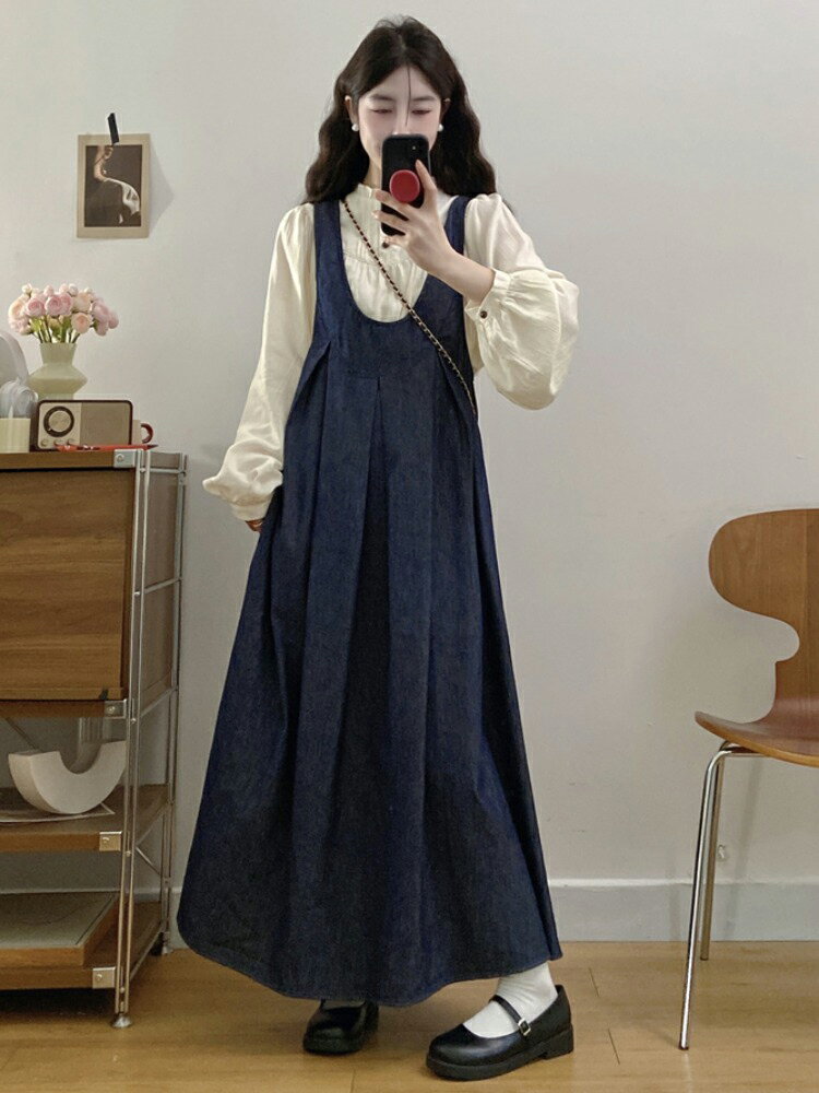ジャンパースカート サロペット デニム ワンピース 春物 春 夏 サロペットワンピ ゆったり ドッキング ワンピース デニムジャンスカ レディース サロペット ロング 重ね着 レイヤード aラインスカート プリーツ フレア カジュアル 大きいサイズ