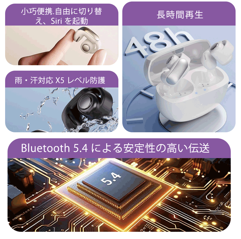 【商品名】スポーツ用 完全ワイヤレスイヤホン(Bluetooth 5.4対応)【様式】対応OS:iOS/Android/Bluetooth対応端末連続駆動時間:単体7.5時間/充電ケース併用時最大19.5時間充電時間:約1.5時間(フル充電時)防水性能:IPX5等級(雨汗対策対応)ドライバー:13mm大口径接続方式:Bluetooth 5.4(低遅延広範囲接続)操作方式:タッチセンサー(片手操作可能)対応機能:Siri/Googleアシスタント起動ゲームモード切替カラー:パープルブラックホワイトグレー【特徴】 1. 運動中でも絶対に落ちない独自の3点支持構造で激しい動きにも対応。ランニングやジムトレーニング中でも耳から外れず、快適な装着感を実現。 2. 臨場感あふれるハイファイ音質業界トップクラスの13mm大口径ドライバーを搭載。深みのある低音とクリアな高音で、音楽はもちろんオンライン会議の声もくっきり再現。 3. 最長48時間の大容量駆動充電ケースと合わせて最大19.5時間連続再生可能。通勤や旅行中に充電切れの心配がなく、380mAhの充電ケースで外出先でも手軽に充電できます。 4. 直感的な片手タッチ操作指一本で曲切り替え音量調整通話操作が可能。長押しでSiriを起動できるから、スマホを取り出さずに操作完了。 5. 日常生活からスポーツまでIPX5防水で雨の日や汗をかくワークアウトシーンでも安心。軽量ボディと肌なじみの良いシリコンパッドで、長時間の使用も疲れません。 【注意事項】商品のお色は撮影時の環境などにより、実際の商品と多少の違いが生じることがございます。実物の色に近づけるように努めていますが、お使いの環境により実物の色と異なって見える場合がございます。ご了承の上お買い求めください。万が一在庫切れや入荷待ちとなる場合は別途メールにてご連絡いたします。本製品の利用による本体の紛失、破損、汚れ、及び内部データの破損には一切補償いたしかねます。同一注文内で発送日が異なる場合一番遅い発送日にまとめて出荷となります。ご注意:海外輸入品のため、入荷時期より部品とデザインなど変更する場合がございますので、予めご了承ください。
