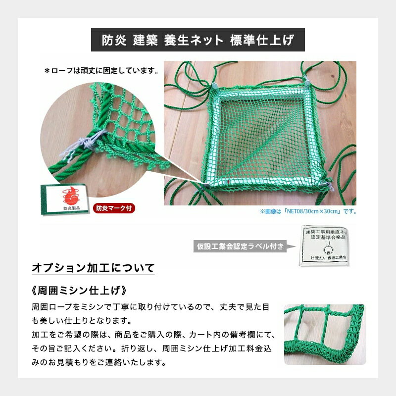 オススメポイント ★【NET07】防炎建築養生ネット ※仮設工業会認定品 -------------------------------------------------- 建設現場での養生、積荷の荷崩れ防止など、四方を固定して使用する場所に最適です。 防炎加工認定品なので、消防指定がある現場でも安心してお使いいただけます。 ★建設工事現場だけじゃない多様な用途 -------------------------------------------------- 建設現場の壁面や棚のまわりなどに設置し落下や追突の防止やゴミ置き場の猫・鳥よけ(防鳥ネット)、お店の防犯ネットとしてなど様々なシーンで活躍します。 ※網目の特性上、上部だけを固定して(カーテンレールなどに吊り下げて)使用したり、何かにかぶせて使用する(固定せずに使用する)場合、形が変形しているように見えます ★もしもの時安心!防炎機能 -------------------------------------------------- もしもの時安心、燃え広がりにくい、延焼を防ぐ機能をプラスしたネットです。防炎マーク付きで公共施設などでもお使いいただけます。 ★1cm単位でサイズオーダー&日本製 -------------------------------------------------- 使いたい場所のサイズに合わせてサイズオーダーができます。ご注文を受けしてから国内の工場にて製作をしています。 商品詳細 ■カラー グレー、ブルー、グリーン ■材質 ポリエステル ■網目大きさ 15ミリ ■網目結節 ラッセル ■糸【太さ】 1.7mmΦ ■糸【規格】 2000T(1800d)/5本 ※2000T(デシテックス)とは10000mあたり2000gの重さがある繊維1本の太さを示します。 ■重量 210g/平米 ■周囲仕上げ 8φ同色ロープ(ポリエチレン)通し加工 手棒ロープ/四隅各2本(1m)+各辺7mおきに2本(1ヶ所)追加 ■注意事項 ・1cm単位でオーダーをお受けしていますが網目の都合上、誤差があります。 ・地面と水平に設置し人受けなどの用途に使用することはできません。 ・オーダー商品のため返品・交換・キャンセルのできない商品です。 ・周囲ミシン仕上げなどのオプション加工も出来ます。お見積もりになりますのでお気軽にお問い合わせください。 ・出荷後の住所・送付先の変更は転送料が必要となりますので、ご注文前にお届け先住所を必ずご確認ください。 ご注文のご注意事項 ■パソコンの環境によりモニター画面上の色と実際の商品の色の見え方が異なる場合がございます。 ■ご注文後の変更・交換・キャンセルはお受けすることができません。 また、出荷後の住所・送付先の変更は転送料が必要となりますので、ご注文前にお届け先住所を必ずご確認ください。 ■ご注文の前に当店のご注文規定を必ずご確認ください。ご注文の際は、こちらのページの内容をご理解いただいたものと判断させていただきます。防炎建築養生ネット【NET07】 建設現場で資材などの落下を防止するネット。建設現場での養生、積荷の荷崩れ防止など、四方を固定して使用する場所に最適です。防炎加工認定品なので、消防指定がある現場でも安心してお使いいただけます。 猫・鳥よけや、店舗などの防犯等にもご利用できます。合成繊維の中で最も日光・風・雨に強いポリエステル素材を使用。耐候性に優れています。 15mmの目合で角目仕立てですから、ボルトなどの小さな物の飛び出しを防ぎます。仮設工業会認定品ですので、安心してご利用いただけます。 カラー 対応サイズ 「○」をタップすると移動します/ ○:オーダー可 幅→ ↓丈/ 〜1m 〜2m 〜3m 〜4m 〜5m 〜6m 〜1m ○ ○ ○ ○ ○ ○ 〜2m ○ ○ ○ ○ ○ ○ 〜3m ○ ○ ○ ○ ○ ○ 〜4m ○ ○ ○ ○ ○ ○ 〜5m ○ ○ ○ ○ ○ ○ ※幅6m以上・丈5m以上をご希望の場合はお問い合わせください。 オススメポイント ★【NET07】防炎建築養生ネット ※仮設工業会認定品 -------------------------------------------------- 建設現場での養生、積荷の荷崩れ防止など、四方を固定して使用する場所に最適です。 防炎加工認定品なので、消防指定がある現場でも安心してお使いいただけます。 ★建設工事現場だけじゃない多様な用途 -------------------------------------------------- 建設現場の壁面や棚のまわりなどに設置し落下や追突の防止やゴミ置き場の猫・鳥よけ(防鳥ネット)、お店の防犯ネットとしてなど様々なシーンで活躍します。 ※網目の特性上、上部だけを固定して(カーテンレールなどに吊り下げて)使用したり、何かにかぶせて使用する(固定せずに使用する)場合、形が変形しているように見えます ★もしもの時安心!防炎機能 -------------------------------------------------- もしもの時安心、燃え広がりにくい、延焼を防ぐ機能をプラスしたネットです。防炎マーク付きで公共施設などでもお使いいただけます。 ★1cm単位でサイズオーダー&日本製 -------------------------------------------------- 使いたい場所のサイズに合わせてサイズオーダーができます。ご注文を受けしてから国内の工場にて製作をしています。 商品詳細 ■カラー グレー、ブルー、グリーン ■材質 ポリエステル ■網目大きさ 15ミリ ■網目結節 ラッセル ■糸【太さ】 1.7mmΦ ■糸【規格】 2000T(1800d)/5本 ※2000T(デシテックス)
