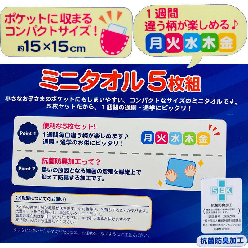 入園入学準備、新生活応援 ミニタオル ★商品詳細★ ●サイズ:約15×15cm ●綿100%(シャーリング染料プリント) ●中国製 【発送方法】メール便発送●子育てママさんの味方でいたいと思っています。すぐ欲しいのご要望にお応えできるように、日々奮闘してます。 ●実店舗同時営業なので、時々、色柄の完売の際は、代品などお知らせしています。 ●幅広い商品点数で、イベント・催事・景品・記念品などにどうぞご利用下さい。 (老人ホームでご利用のバスタオル 干支タオル シートクッション 敬老の日 記念品 ガーゼ手ぬぐい 学校行事の運動会 部活動 送別会 などの 景品 フェイスタオル 子供会 クリスマス会 プレゼント ひざ掛け毛布 大判バスタオル など) ●大量注文の際は、一度お問合せ下さい。ラッピング(一部有料)など用途に合わせてご使用日に間に合わせます!