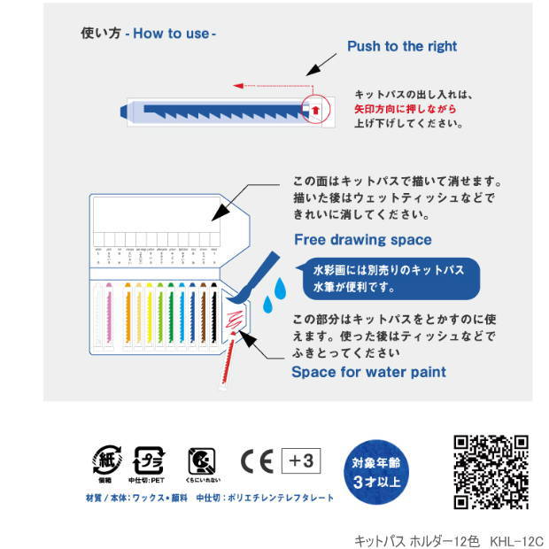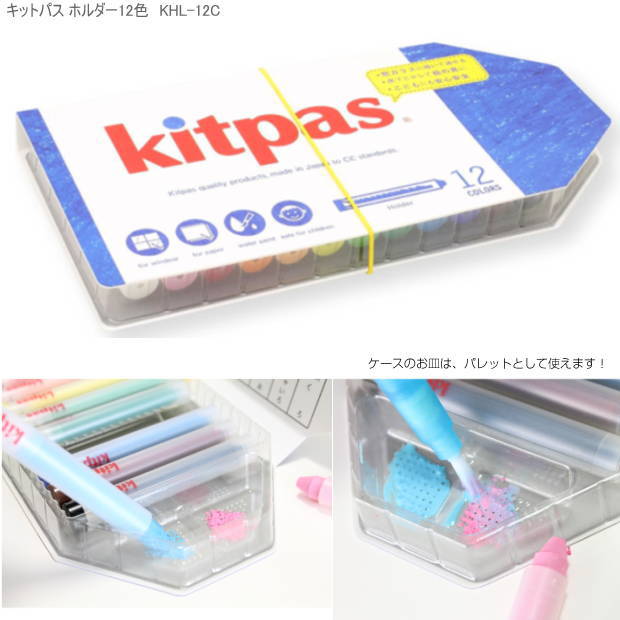 キットパスリニューアル第一弾。 子供から大人までオール世代に向けた商品が新発売。 ホルダー入りキットパスが12色セットになりました。 持ちやすく手をよごしにくいホルダー入りのキットパスです。 パッケージの一部分がパレットになっているので、手軽に絵の具としてつかえます。 ぜひ水筆と一緒にご活用ください。 商品名 Kitpas キットパスホルダー 12色 品番 KHL-12C サイズ 244×116×22mm 重さ207g マーカー:直径10mm×長さ70mm/ホルダー:直径14mm×94mm 仕様 日本製 メーカー 日本理化学工業株式会社 窓ガラスやホワイトボード等のつるつるしたところに描いて濡れた布で消せるキットパス。窓ガラスいっぱい、親子で一緒におえかき!なんてことも。固形絵の具のようにも使えるので、水彩画を描いたり、のびのび自由に感性のままにおえかきを楽しめます。 ※他のモール及び店頭売りと在庫を併用しておりますのでご注文後でも在庫切れの場合がございますのであらかじめご了承下さい。 キットパス ホルダー12色 おふろdeキットパスシートセット フェイス&ボディペイント用キットパス あそボディ 6色 ミニ キットパスブロック 紙巻太字のキットパス12色 おふろで書けるシートセット おふろでキットパス 貼ってはがして書いて消せるテープ黒板30mm キットパス リトルアーチスト お絵かきセット サクラ ピグマックス ツイン 8色セット 中身が見える薄型バッグインバッグA4 機能性を極めた頑強な携帯マルチはさみ 文具エプロンバッグ ミニ BE009