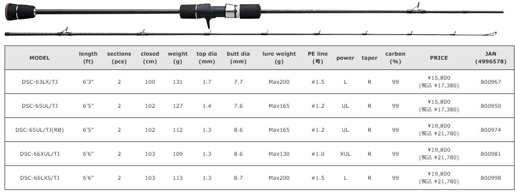 タチウオジギングのエントリーに最適な専用ロッド。 ドラゴンスティックはメタルジグが気持ちよくジャークしやすいアクションを設定。グリップはどんな握り方でも握りやすい太めに設計し、持ち運びにも便利な2ピース仕様。「ドラゴン級」はもちろん、不意の大物にも対応できるバットパワーを持ち合せ、2ピースながら安心して使用いただけるライトジギングロッドに仕上げています。 DSC-65UL/TJ(RB) 従来モデルの操作性を継承しながらブランクス、グリップ等を見直した、160gまでのメタルジグを使用するタチウオジギングのベーシックモデル。全体的に柔軟なブランクスにより、誘い上げのジャークに入る際のローレスポンスアクションを自動的に演出し、繋ぎ目のないナチュラルアクションを演出できます。