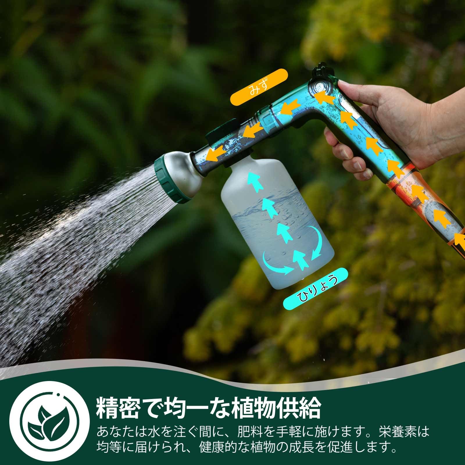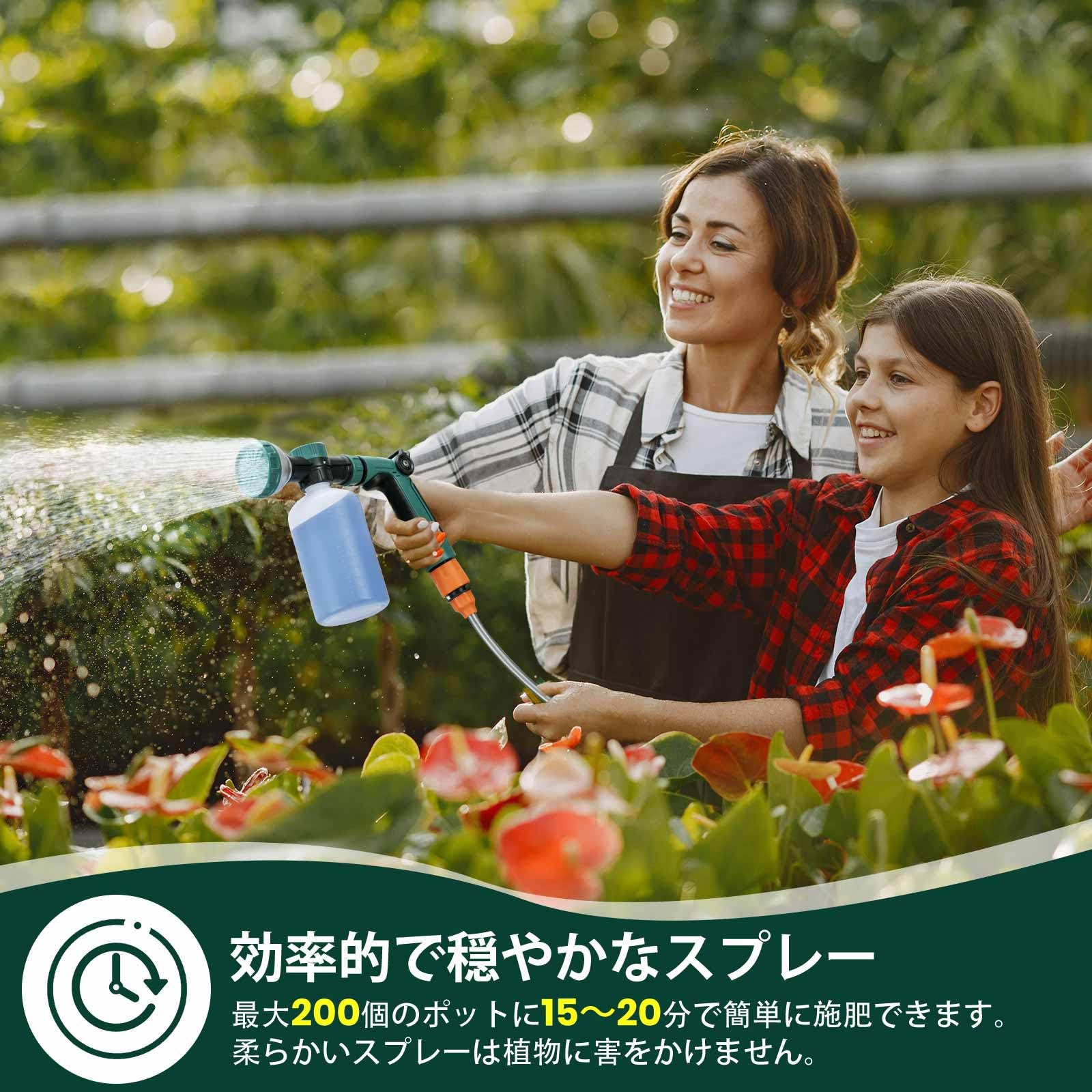 商品情報商品の説明主な仕様 安定した肥料濃度: 水圧が安定している限り、噴射される肥料の濃度は均一に保たれ、最初に濃く後から薄くなることはありません。これにより、植物の健康をサポートし、肥料の無駄を最小限に抑えます。 均一な栄養供給: サイフォン式のホース肥料スプレーは、どんな屋外ホースにも簡単に接続でき、コンテナや庭の植物に対して正確で連続的、かつ安定した施肥を実現します。花、野菜、樹木、低木に最適です。 水やりと同時に効率的な施肥: 500mlの詰め替え可能なボトルを備えた当社のガーデンホースノズルスプレーは、流量設定を調整することで、施肥プランをカスタマイズできます。100平米の庭で約200個のポットに対し、わずか2回の補充で施肥を完了し、作業時間は15〜20分ほどです。 優しいスプレー: ホーススプレーノズルはシャワーモードを備えており、繊細な植物にも最適です。根元に直接水を与えることができ、植物を傷つけることなく効果的に水やりが可能です。漏れ防止および詰まり防止設計により、園芸の効率と植物の健康を促進します。 人間工学に基づいた安全スプレー: 使用者の快適さを考慮したデザインで、親指で操作できるトリガー、滑りにくいハンドル、および化学物質の逆流を防ぐ逆流防止装置を備えており、当社の芝生&庭用ホーススプレーは簡単かつ効率的に使用できます。 多目的な用途: 取り外し可能なボトルは、肥料の適用器としても、石鹸ディスペンサーとしても機能します。このホースアタッチメントスプレーにより、施肥、水やり、洗車、パティオの掃除などの作業を簡単に切り替えることができます。ただし、施肥に一度使用したスプレーは、その目的専用に使用し、残留物による潜在的な害を防ぐため、他の用途には使用しないことをお勧めします。 耐久性のある構造: 丈夫なABS素材で作られた当社の頑丈なホースノズルスプレーは、優れた耐久性と耐衝撃性を持ち、日々の使用による摩耗にも耐え、長寿命をします。 安心のサポート: VENETIOのガーデニングツールで、楽しい園芸ライフを始めましょう。使用中に問題が発生した場合、90日以内であれば、個別対応のサポート、交換、もしくは返品対応をいたしますので、お気軽にご連絡ください。