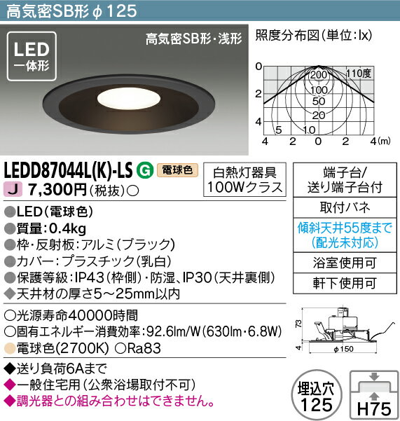 東芝ライテック LEDD87044L(K)-LS アウトドア 軒下用ダウンライト LED一体形 電球色 高気密SB形・浅形 埋込穴φ125 ブラック 電源ユニット内蔵