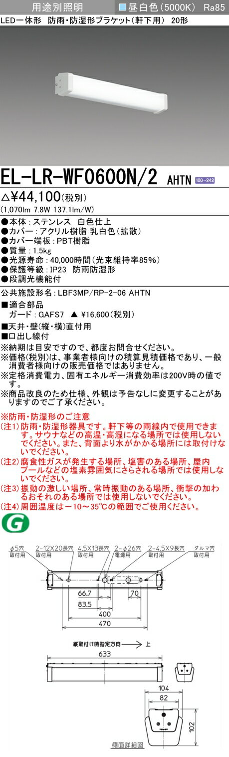 三菱 EL-LR-WF0600N/2 AHTN 屋外用照明 ブラケット 固定出力・段調光機能付 昼白色 LED一体形 壁面直付形・天井面取付兼用形 防雨・防湿形 受注生産品 [§]