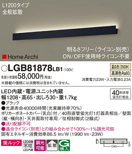 パナソニック LGB81878LB1 ラインブラケット L1200タイプ 調光(ライコン別売) LED(温白色) 天井・壁直付型 美ルック 拡散 ブラック