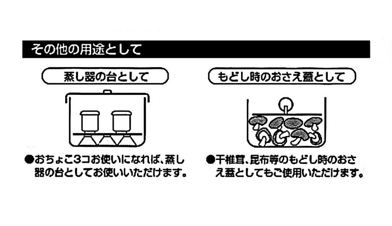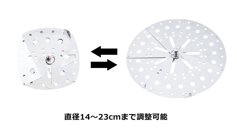 PRO SERIES ステン フリーサイズ 落し蓋 14~23cmサイズ(約):14×12.6×2.5cm本体重量(約):0.152kg用途:蒸し器の台、干し椎茸等のもどし時のおさえ蓋等伸縮サイズ:14~23cm大きさを変える時:折り曲げてある部分を指でつまんで持ち上げる感じで操作する。左へ回すと大きくなり、右へ回すと小さくなる。注意:ご使用前、又はご使用後は食器用洗剤をスポンジに付けて洗ってください。