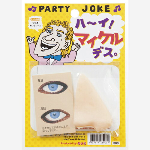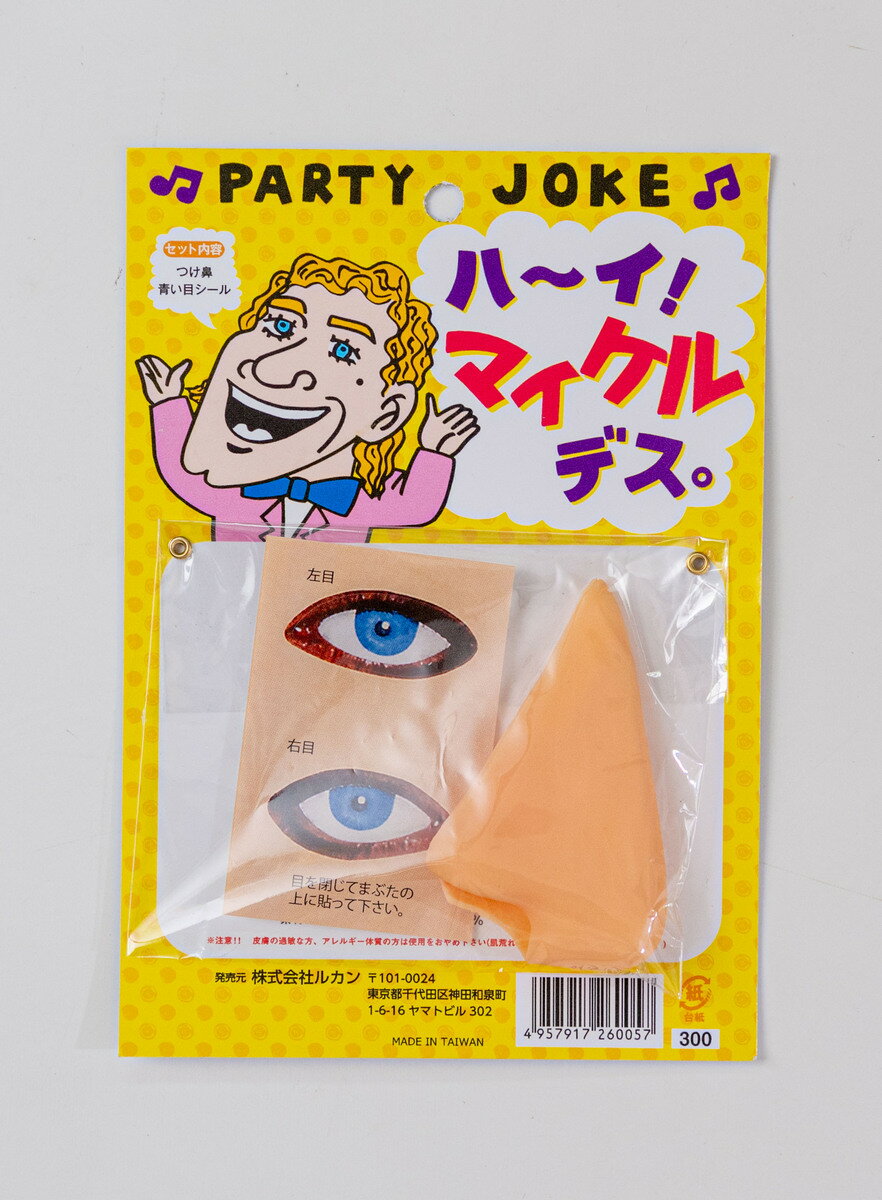商品情報商品説明●商品説明:かんたん変装の定番!漫才やコントの小道具としてパーティー、忘年会、2次会などの余興でも活躍。またはお笑い系のタレント志望の方にもオススメ セット内容●セット内容:つけ鼻、目のシール注意モニター発色の具合により色合いが異なる場合がございます。ハ~イ! マイケルデス。 パーティーグッズ ユーモアグッズ ジョークグッズ パーティー イベント お遊戯会 学園祭 ハロウィン 舞台 小道具 変身 仮装 変装 宴会 2次会 装着するだけで自然と笑いが出るおもしろグッズです! ●商品説明:かんたん変装の定番!漫才やコントの小道具としてパーティー、忘年会、2次会などの余興でも活躍。またはお笑い系のタレント志望の方にもオススメ ●セット内容:つけ鼻、目のシール 5