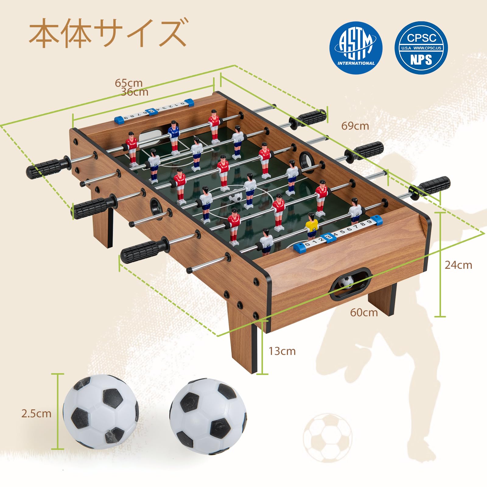 ・本体サイズ:幅70×奥行36×高さ25cm / 材質:MDF+PP+鉄パイプ / 本体重量:(約)3.5kg・・【捆包内容】1 x サッカー盤 / 18 xサッカー選手 / 2 x ミニサッカーボール / 2 x スコアボード・・【自宅で楽しむサッカー体験】手軽にサッカーの楽しさを感じられるテーブルサッカーゲームが新登場!手動スコアボードや18人のキーパー、ミニボールがセットになっていて、自宅で本格的なサッカーの興奮を楽しむことができます。友達や家族と熱い試合を繰り広げ、盛り上がること間違いなしです。・・【安定感と操作性に優れた設計】頑丈なボードとスチールロッドを使用しており、安定性と耐久性は抜群です。摩擦の少ないサッカーピッチにより、ボールがスムーズに滑り、リアルなプレイが楽しめます。さらに、ハンドルは握りやすく、しっかりとしたコントロールを可能にします。これで、思い通りのシュートやパスも簡単に決まります。・・【どこでも楽しめる手軽さ】軽量なデザインなので、持ち運びも簡単。地下室やゲームルームはもちろん、キャンプや友達の家でも大活躍します。屋外のパーティーや集まりでも、このサッカー盤があれば、みんなで楽しめて、盛り上がること間違いありません。ルールもシンプルなので、子供から大人まで、すぐに楽しむことができます。本体サイズ:幅70×奥行36×高さ25cm / 材質:MDF+PP+鉄パイプ / 本体重量:(約)3.5kg