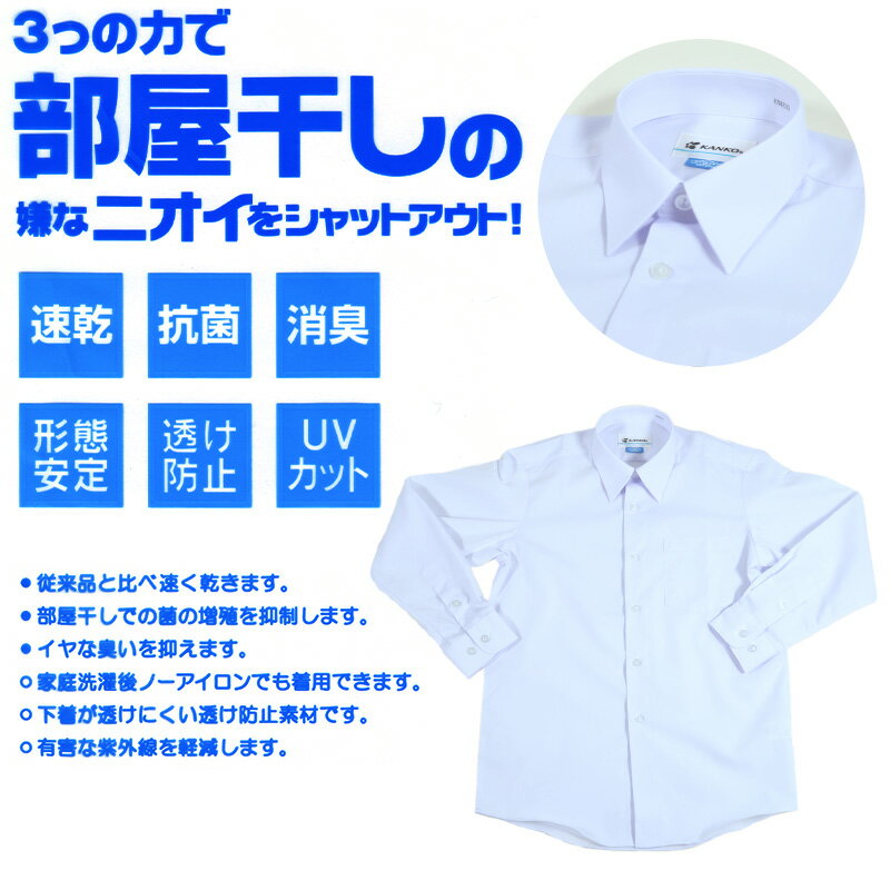 ◆学生服 形態安定 男子 長袖カッターシャツの紹介学生服 形態安定 男子 長袖カッターシャツです。こちらは165cmA〜180cmBまである大きいサイズとなります。3つの力で部屋干しの嫌なニオイをシャットアウト!ルームドライ 部屋干し対応速乾加工・抗菌防臭加工を施しているため、ニオイの元である菌の繁殖を防ぎます。たとえニオイが発生しても消臭加工を施しているため安心です。・形態安定 シワになりにくい形態安定加工を施しています。・透けにくい 透けにくい特殊な糸を使用しているため、 防透け性に優れています。◆学生服 形態安定 男子 長袖カッターシャツの詳細商品名学生服 形態安定 男子 長袖カッターシャツ対象者キッズ・ジュニア(子供・子ども・こども)男の子(男児・男子・ボーイ・男子・ボーイズ・メンズ)小学生・中学生・高校生サイズ165cmA170cmA175cmA180cmA185cmA190cmA150cmB160cmB170cmB180cmB※B体はゆったりサイズカラー白素材・加工ポリエステル65%/綿35%速乾/抗菌/防臭/形態安定/透け防止/UVカット洗濯脱水可能/乾燥機対応していません生産国日本企画海外製関連キーワードN4830 sc-shi-cut KN4830学生服 形態安定 男子 長袖カッターシャツこの商品を買った人はこんな商品も買っています◆おすすめのカテゴリ 学生服 形態安定 男子 長袖カッターシャツです。こちらは165cmA〜180cmBまである大きいサイズとなります。3つの力で部屋干しの嫌なニオイをシャットアウト!ルームドライ 部屋干し対応速乾加工・抗菌防臭加工を施しているため、ニオイの元である菌の繁殖を防ぎます。たとえニオイが発生しても消臭加工を施しているため安心です。・形態安定 シワになりにくい形態安定加工を施しています。・透けにくい 透けにくい特殊な糸を使用しているため、 防透け性に優れています。