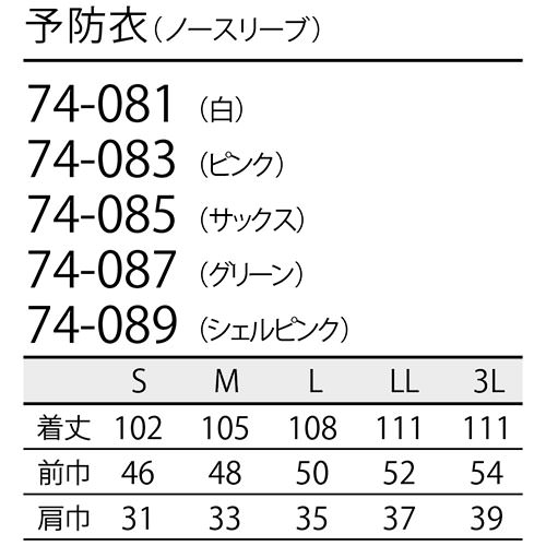 同一シリーズ74-065、74-069、74-067、74-063、74-061 予防衣 長袖(女性用)|商品名|予防衣 ノースリーブ(女性用)|メーカー|住商モンブラン|品番|74-087、74-085、74-089、74-083、74-081|カラー|グリーン、サックス、シェルピンク、ピンク、白|サイズ|S、M、L、LL、3L|商品説明|ペン差し付き(右ポケット)|素材|交織ポプリン:ポリエステル85% 綿15%|機能|制菌|サイズ区分|レディース 女性用|シリーズ|予防衣2|交織ポプリン|丈夫で洗濯に強く、速乾性にも優れた素材。軽やかな着心地の薄手素材で、しなやかな肌触りもポイントです。|よく使われるシーン|病院、クリニック、病棟、医院、外科、内科、耳鼻科、眼科、整形外科、形成外科、歯科、審美歯科、エステサロン、脱毛サロン、健康診断、カイロ、整体、接骨院、マッサージ、研修医、手術、オペ、医学部、看護、実習|メインカテゴリ|医療用ユニフォーム>エプロン・予防衣>予防衣|配送方法|通常:宅配便(メール便不可商品)◆送料込みの表示がある商品でも、北海道・沖縄県は別途送料2,835円を頂戴します。当店及びメーカーで欠品の場合でもご購入でいる場合がございます。欠品時の納期はメールでご連絡します。注文確認メールが届かない場合はお電話にてお知らせ致しますので届かない旨を必ずご一報下さい。◆全ての商品に返品交換の可否を記載しております。交換時に発生する諸費用はお客様のご負担となります。詳しくはご利用ガイドをご覧ください。 → ご利用ガイドへ住商モンブランのメディカル 予防衣 制菌加工を付与、患者さんとの距離が縮まるもう一枚のユニフォーム住商モンブランは、医療・介護の現場で働く人のために、快適な着心地とスタイリッシュなデザインを両立。チームでコーディネートできる豊富なカラー展開も魅力です。スポーツメーカーのアシックスならではのスポーツ工学研究所から生まれた技術・ノウハウを医療の現場に活かし、快適性と動きやすさを追求した商品が魅力です。また、鮮やかな花柄で上品さと華やかさが魅力のローラアシュレイやアイドルグループの衣装を手掛けるオサレカンパニーとのコラボ商品、世界的デザイナーのコシノジュンコがデザインした究極の「機能美」を追求したドクターコートなど医療現場を華やかにしてくれる商品が満載です。ご確認事項こちらの商品は交換可能・返品不可となります。※交換には別途手数料がかかります。詳しくはこちらこの商品はお取り寄せになりますこちらの商品は、ご注文確認後メーカーより取り寄せとなります。他のサイトでも同時販売しておりますので、在庫更新のタイミングにより商品をご用意できない場合がございます。メーカー在庫が欠品の場合もございますので予めご了承ください。別途、メールにてご案内させていただきます。シーズン品につきましては、在庫変動が激しいため欠品の可能性がございます。お急ぎの場合は、お手数ですがご購入前に在庫のご確認をお願いいたします。