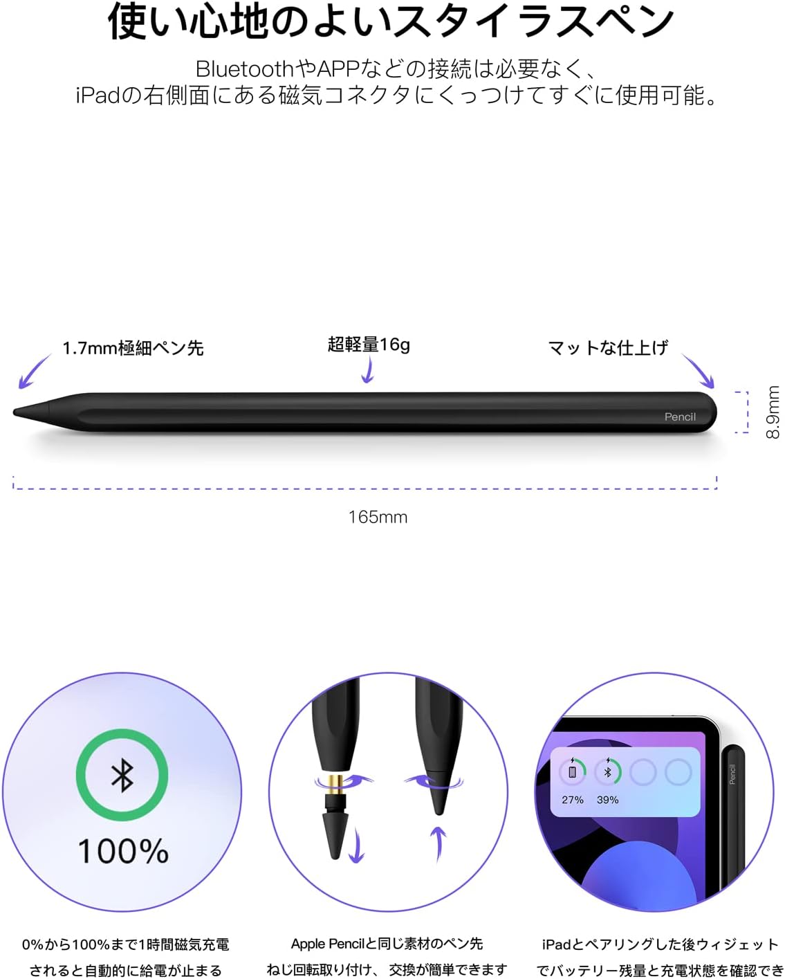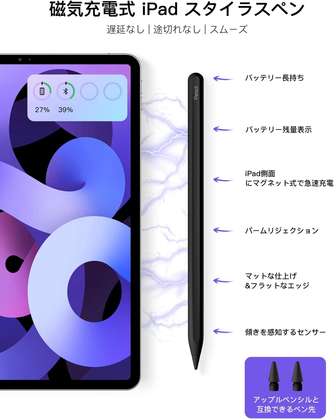 この商品は Stouchi スタイラスペン iPad ペンシルブラックrt39 ポイントiPad ペンシル 磁気吸着充電式 タッチペン スタイラスペン ブラック ★【高級感溢れる質感&使いやすい】STOUCHIスタイラスペンの外部はマット仕上げで、持ちやすくて、環境に優しいプラスチック素材を採用し、細部までにこだわった高級感溢れる質感が自分用にもプレゼントにも最適なアイテムです。本体は16gで、Apple Pencil 2より軽量で、長時間持っていても負担になりません。Bluetooth接続不要で、スイッチを押す必要もなく、iPadの右側面にある磁気コネクタにくっつけて自動的にONになり、すぐに書き始められます。これ一本で同時に複数のiPad Pro/iPad air/iPad miniに使えます。非常に使いやすいです。パッケージ内容: Pencilx1、日本語マニュアルx1、シリカゲル生地の収納ケースx1、予備のペン先x2、専用的なワイヤレス充電ゲーブルx1。 ショップからのメッセージ ★【マグネット吸着とワイヤレス充電対応&長時間使用】STOUCHIタッチペンは、磁気吸着充電式デジタルペンシルです。約30秒充電で9分間、1時間フル充電で8時間連続使用可能となります。iPadを持ち運んでいる間も充電を続けられ、1時間(バッテリー残量0%から100%まで)フル充電からしばらくすると自動充電停止でき、iPadの本体の電池を無駄に消費する心配がなく、10分間放置すると自動オフし、電源の切り忘れを防止でき、バッテリーの節約に役立ちます。磁気吸着機能が付き、出張、会議などに持ち運びに便利で、落下や紛失の心配もありません。また、iPadとペアリング後iPadからウィジェットでタッチペンのバッテリー残量と充電状態を確認できます。★【ペアリングと充電自動&書き心地がよい】iPadの右側面にある磁気コネクタにくっつけて自動的にペアリング完了と充電始め、手動でペアリングが必要ないです。ペン先は純正Apple Pencilと互換性ある超耐摩耗性のペン先で、精度感度耐摩性が改良されて、ピクセルレベルの精密さと感じられないくらい微小なタイムラグを持ち、遅延も誤差もなくて、小さい文字でも書けて繊細な表現が可能です。滑らかな先端は、デバイスとの摩擦を減らし、画面を損傷しません。鉛筆のように簡単で自然に使用できます。★【多機能搭載】STOUCHI iPadタッチペンはパームリジェクション機能と傾き検知機能が搭載しており、手が画面に触れても誤作動がなく、それに傾きを感知できるので、チップの配置角度によって線の太さを動的に調節することができ、絵を描く時、スケッチする時、色を塗る時、メモを取る時、PDFに注釈を加える時などに最適です!(ご注意:筆圧検知機能とダブルタップでツールを切り替える機能は非対応です。傾き感知機能対応ソフト:SketchBook、Procreate、Paper、Noteshelf )★【互換性&安心保証】iPad Pro 12.9インチ(第3/4/5/6世代)、iPad Pro 11インチ(第1/2/3/4世代)、iPad Air(第4/5世代)、iPad Mini(第6世代) に対応しています。iPad Pro 12.9インチ(第1/2世代)、iPad Pro 10.5インチ、iPad Pro 9.7インチ、iPad Air(第1/2/3世代)、iPad Mini(第1/2/3/4/5世代)、iPad(第1/2/3/4/5/6/7/8/9/10世代)には対応しておりません。予めご了承ください。 納期について 4