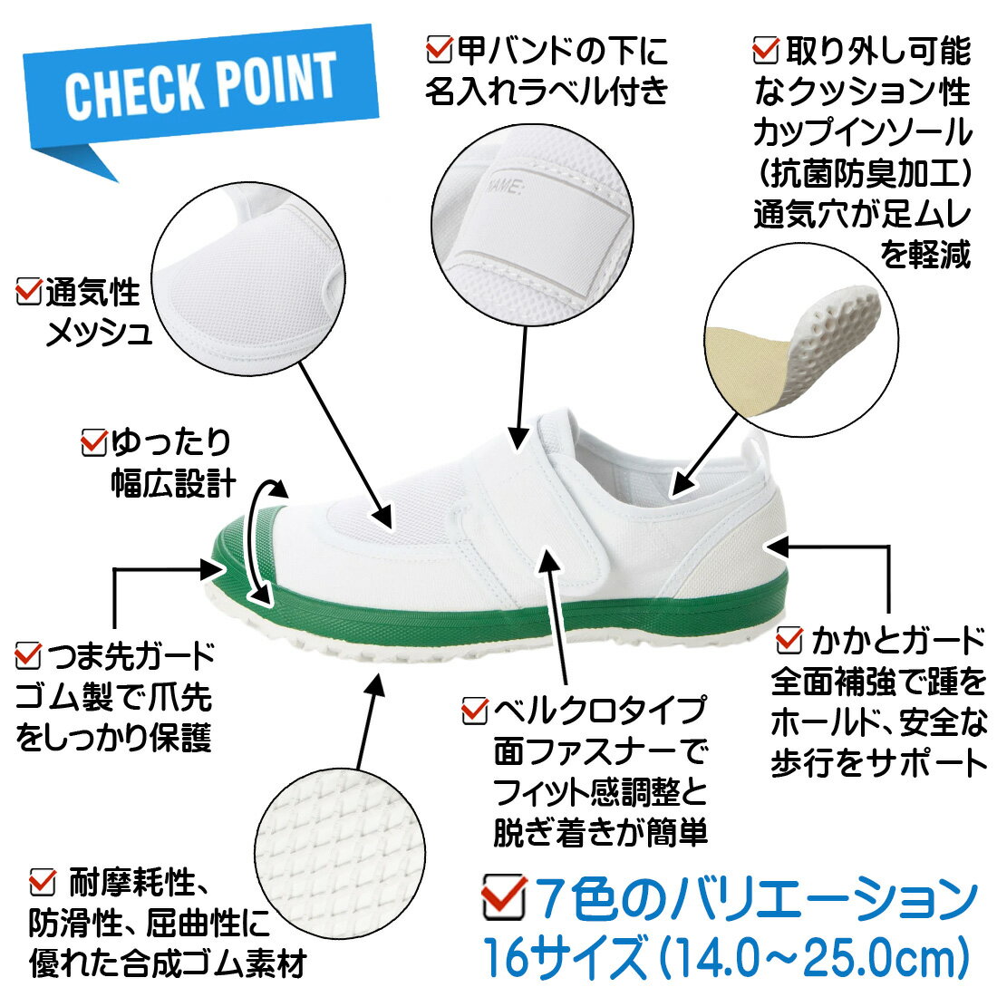 2足セット 上履き 上靴 スクールシューズ↑↑↑↑↑↑こちら↑↑↑↑↑↑他2足を希望の場合にクリック下さい。品番:23999 上履き 7カラー 専用バッグ付き↑↑↑↑↑↑クリックで各種へ↑↑↑↑↑↑各種の1足を希望にお場合は、画像をクリック下さい。ブランドK's Plus ケーズプラス内容キッズ ジュニア用 スニーカー2足セット(7色より2足)・ホワイト 14cm〜25.0cm・レッド 14cm〜25.0cm・イエロー 14cm〜25.0cm・ネイビー 14cm〜25.0cm・グリーン 14cm〜25.0cm・ピンク 14cm〜25.0cm・ライトブルー 14cm〜25.0cm企画製造日本でオリジナル企画、中国で委託生産サイズサイズ:19.0cm/20.0cm/21.0cm/21.5cm/22.0cm/22.5cm/23.0cm/23.5cm/24.0cm/24.5cm/25.0cm甲周り:3E(EEE)幅広※カラー・サイズを確認をしてお選びください。素材甲材:キャンバス+メッシュ底材:合成ゴム中敷:取り外し可能なカップインソール (DUPONT SILVADUR 抗菌防臭加工)特徴 仕様ベルクロ (マジックテープ) タイプのメッシュ上履き。ベルクロバンドだから脱ぎ履きが簡単で、締め具合でお好みのフィット感に調整が出来ます。甲の一部にメッシュ素材を使用、カップインソールにも通気穴を加工して、イヤな足ムレを軽減します。また、カップインソールはアメリカデュポン社の薬剤を使用して抗菌防臭加工を施されており、取り外して丸洗いが出来るので、靴を清潔を保つことが出来ます。つま先はゆったりとした幅広設計で足指の窮屈感が無く、ゴムキャップで補強しているので爪先をしっかり保護します。かかと部もゴム素材で全面補強、かかとをしっかりホールドし、安全な歩行をサポートします。靴底は防滑性と屈曲性に優れた合成ゴムを採用、防滑意匠も施しているので滑りにくく安心です。ベロ部には名前記入ラベルを縫い付けており、名入れが可能です。普段はベルクロバンドに隠れて見えないようになっているのもポイントです。7色のカラーバリエーション、14.0cm〜25.0cmと豊富なサイズをご用意しました。通園・通学・通院での使用はもちろん、リハビリ・介護など、屋内外で使用する靴として幅広い場面で活躍する一足です。◆店長のオススメポイント上履き(上靴)の材質と製法は、射出成型(塩化ビニール甲材とPVC樹脂)と加硫成型(キャンバス甲材と天然ゴム)に大別されています。この商品はキャンバス甲材を使用、天然ゴムによる加硫成型を採用し、PVC樹脂による射出成型より、ワンランク上の商品です。ゴム底は防滑性、屈曲性、耐摩耗性に優れており、キャンバス甲材は丈夫で肌に優しく、カップインソールは、通気性・清潔性・クッション性、さらに抗菌防臭加工を施しています。成長期のお子様に、このような機能性満載の上履きをお勧めいたします。【新学期応援!今なら当店オリジナル、キャンバス生地のシューズバッグをプレゼント中!持ち運びや保管に使えるので是非ご利用ください!】サービス- シューズ & サービス 満足館 安心お買い物サービス -1.送料は全国一律無料だからお支払い金額が分かりやすく安心! ※ 沖縄・離島は500円の追加送料をいただきます2.サイズ交換の再送料も無料だから靴のネット通販でも安心! ※ ご返送いただく際の発払料金はご負担をお願いします3.14時迄のご注文は即日発送[あす楽] 対応ですぐ届くから安心! ※ 土・日・祝は発送業務のみとなります他詳細は[支払・送料] [返品・交換]をご確認ください。※クリック確認ください。ベルクロ (マジックテープ) タイプのメッシュ上履き。ベルクロバンドだから脱ぎ履きが簡単で、締め具合でお好みのフィット感に調整が出来ます。甲の一部にメッシュ素材を使用、カップインソールにも通気穴を加工して、イヤな足ムレを軽減します。また、カップインソールはアメリカデュポン社の薬剤を使用して抗菌防臭加工を施されており、取り外して丸洗いが出来るので、靴を清潔を保つことが出来ます。つま先はゆったりとした幅広設計で足指の窮屈感が無く、ゴムキャップで補強しているので爪先をしっかり保護します。かかと部もゴム素材で全面補強、かかとをしっかりホールドし、安全な歩行をサポートします。靴底は防滑性と屈曲性に優れた合成ゴムを採用、防滑意匠も施しているので滑りにくく安心です。ベロ部には名前記入ラベルを縫い付けており、名入れが可能です。普段はベルクロバンドに隠れて見えないようになっているのもポイントです。7色のカラーバリエーション、14.0cm〜25.0cmと豊富なサイズをご用意しました。通園・通学・通院での使用はもちろん、リハビリ・介護など、屋内外で使用する靴として幅広い場面で活躍する一足です。◆店長のオススメポイント上履き(上靴)の材質と製法は、射出成型(塩化ビニール甲材とPVC樹脂)と加硫成型(キャンバス甲材と天然ゴム)に大別されています。この商品はキャンバス甲材を使用、天然ゴムによる加硫成型を採用し、PVC樹脂による射出成型より、ワンランク上の商品です。ゴム底は防滑性、屈曲性、耐摩耗性に優れており、キャンバス甲材は丈夫で