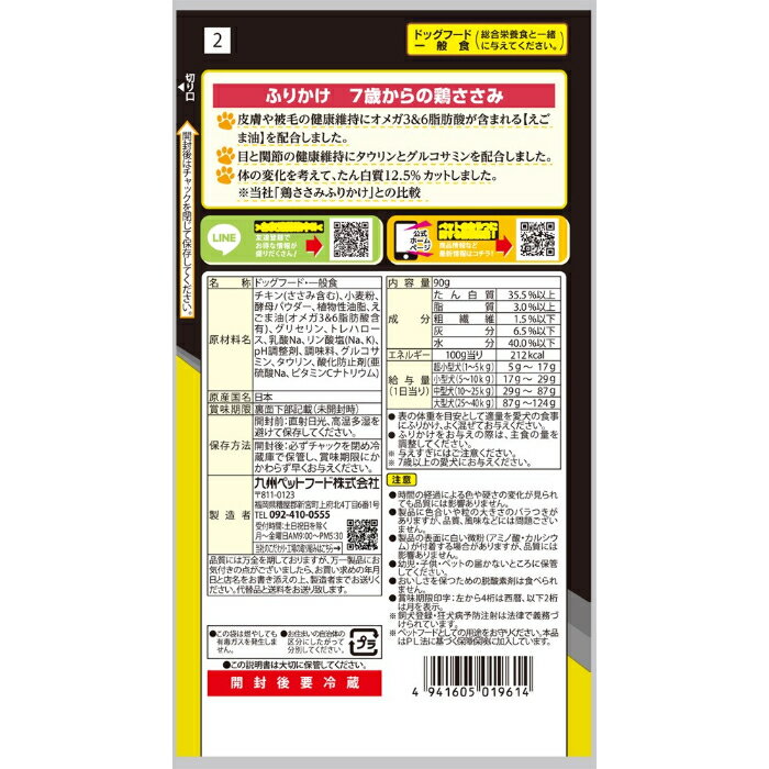 皮膚や被毛の健康維持にオメガ3&6脂肪酸が含まれる【えごま油】を配合しました。 目と関節の健康維持にタウリンとグルコサミンを配合しました。 体の変化を考えて、たん白質12.5%カットしました。 ※当社「Q-Petふりかけ鶏ささみ」との比較【使用方法】表の体重を目安として適量を愛犬の食事にふりかけ、よく混ぜてお与えください。 ふりかけをお与えの際は、主食の量を調整してください。 ※与えすぎにはご注意ください。 ※7歳以上の愛犬にお与えください。【原材料】チキン(ささみ含む)、小麦粉、植物性油脂、えごま油(オメガ3&6脂肪酸含有)、プロピレングリコール、グリセリン、トレハロース、乳酸Na、リン酸塩(Na、K)、調味料、食塩、グルコサミン、タウリン、保存料(ソルビン酸)、酸化防止剤(ビタミンCナトリウム)【保証成分】たんぱく質35.5%以上、脂質3%以上、粗繊維1.5%以下、灰分6.5%以下、水分40%以下【エネルギー】212kcal/100g【メーカー名】九州ペットフード株式会社【原産国または製造地】日本【諸注意】時間の経過による色や硬さの変化が見られても品質には影響ありません。製品に色のバラつきがありますが、品質、風味などには問題ございません。製品の表面に白い微粉(アミノ酸・カルシウム)が付着する場合がありますが、品質には影響ありません。子供が愛犬に与える時は安全のために大人が立ち会い、手などを噛まれないようにご注意ください。幼児・子供・ペットの届かないところに保管してください。おいしさを保つための脱酸素剤は食べられません。また、開封後は効果がなくなりますのでお捨てください。