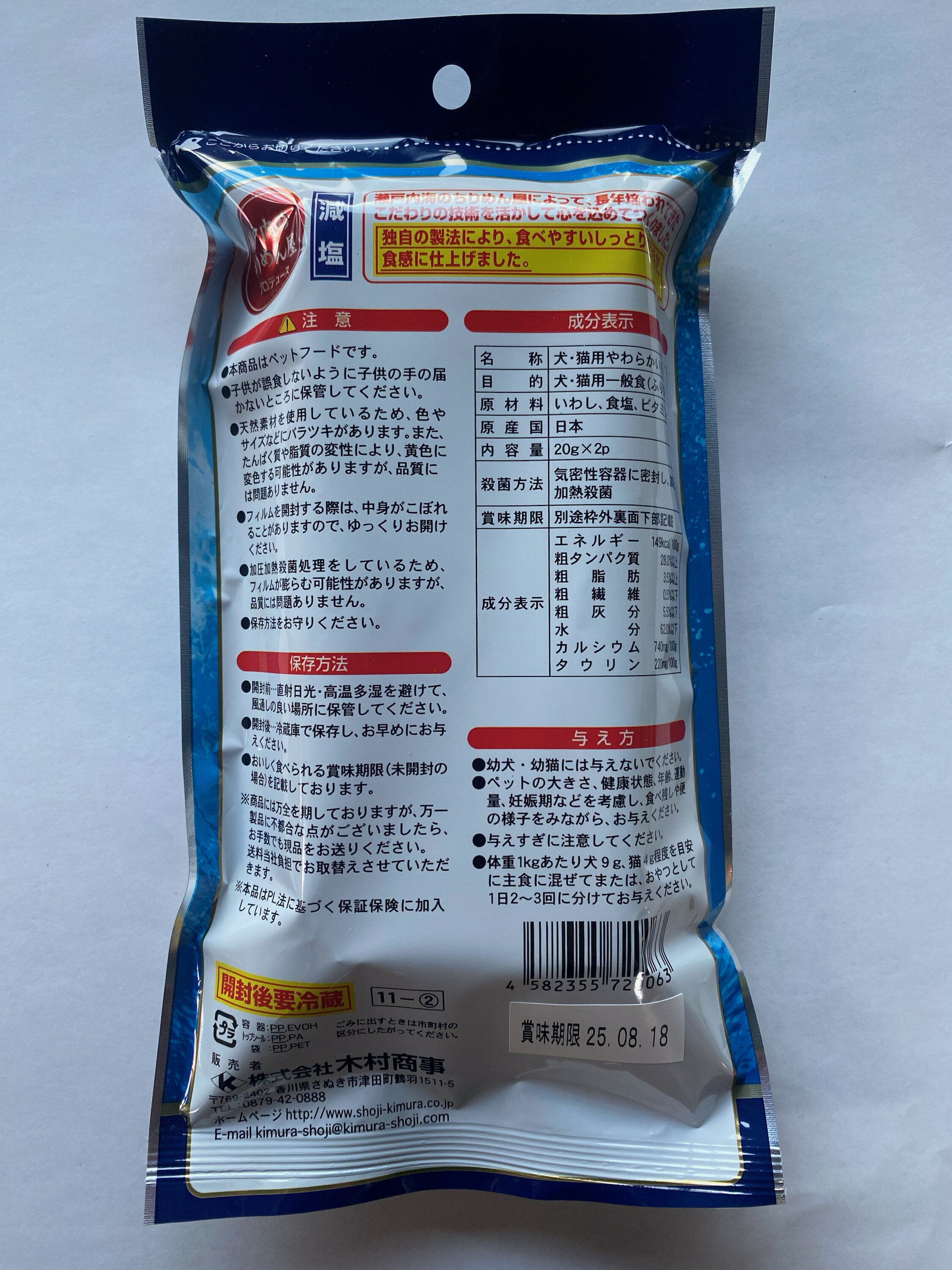 [商品サイズ(mm)]130×30×240[単品重量(g)]54 [栄養成分]たんぱく質28.0%以上、脂質3.5%以上、粗繊維0.5%以下、灰分5.5%以下、水分62.0%以下[原材料]いわし、食塩、ビタミンE[商品説明]やわらかい食感のかえりいりこです。レトルト殺菌済み、食べ切りサイズでいつでも新鮮です。[使用方法・給与方法]幼犬・幼猫には与えないでください。ペットの大きさ、健康状態、年齢、運動量、妊娠期などを考慮し、食べ残しや便の様子を実ながらお与えください。与えすぎにご注意して下さい。体重1kgあたり犬9g、猫4g程度を目安に主食に混ぜてまたは、おやつとして1日2~3回に分けてお与えください。[使用上の注意]本商品は、ペットフードです。子供が誤食しないように子供の手の届かないところに保管してください。天然素材を使用しているため、色やサイズにバラつきがあります。また、たんぱく質や脂質の変性により、ピンク色や黄色に変色することがありますが品質には問題ありません。フィルムを開封する際は、中身がこぼれることがありますので、ゆっくりお開け下さい。加圧加熱殺菌処理をしているため、フィルムが膨らむ可能性がありますが、品質には問題ありません。保存方法をお守りください。[お手入れ・保管方法]開封前:直射日光・高温多湿を避けて、風通しの良い場所に保管してください。開封後:冷蔵庫で保存し、お早めにお与えください。おいしく食べられる賞味期限(未開封の場合)を記載しております。[詳細]瀬戸内海のちりめん屋で長年培われてきたこだわりの技術を活かして作りました。安心安全、しかも美味しい、自然素材のおやつです。[コンセプト]国産のいりこを独自の製法で食べやすくしっとりやわらか食感に仕上げています。おやつとしても、主食のふりかけとしてもご使用いただけます。減塩タイプですので、どのステージのワンちゃん・猫ちゃんにもおすすめです。[原産国]日本[製造販売]株式会社木村商事〒769-2402香川県さぬき市津田町鶴羽1511-5JAN:4582355720063