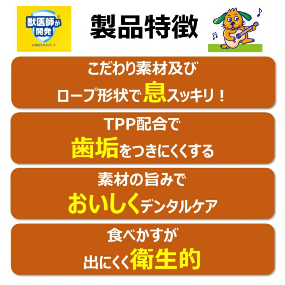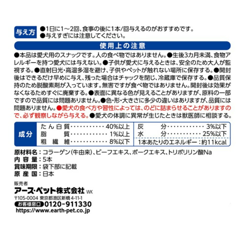 [商品サイズ(mm)]140×20×200[単品重量(g)]27 [エネルギー]約11kcal/1本[栄養成分]たんぱく質40%以上、脂質1%以上、粗繊維8%以下、灰分3%以下、水分25%以下[原材料]コラーゲン、ビーフエキス、ポークエキス、トリポリリン酸ナトリウム[商品説明]・コラーゲン素材を一本一本ていねいに編み込んで作った噛み応えのあるロープ[使用方法・給与方法]●1日に1~2回、食事の後に1本/回与えるのがおすすめです。●与えすぎには注意してください。[使用上の注意]●本品は愛犬用のスナックです。人用のものと混同しないようにする。●生後3カ月未満、食物アレルギーを持つ愛犬には与えない。●子供がペットに与えるときは、安全のため大人が監視する。●直射日光・高温多湿を避け保存する。●子供やペットが触れない場所に保存する。●開封後はできるだけ早めに与え、残った場合はチャックを閉じ、冷蔵庫で保存する。●品質保持のため脱酸素剤が入っています。無害ですが食べ物ではありません。開封後は効果がなくなるためすぐに廃棄する。●表面に異なる色が見えることがありますが、原料の一部ですので品質には問題ありません。●色・形・大きさに多少の違いはありますが、品質には問題ありません。●愛犬の食べ方や習性によっては、のどに詰まらせることがありますので、必ず観察しながら与える。●愛犬の体調に異常が生じたときは獣医師に相談する。[原産国]日本[製造販売]アース・ペット株式会社EBC〒105-0004東京都港区新橋4-11-1 A-PLACE新橋 2FJAN:4994527939300