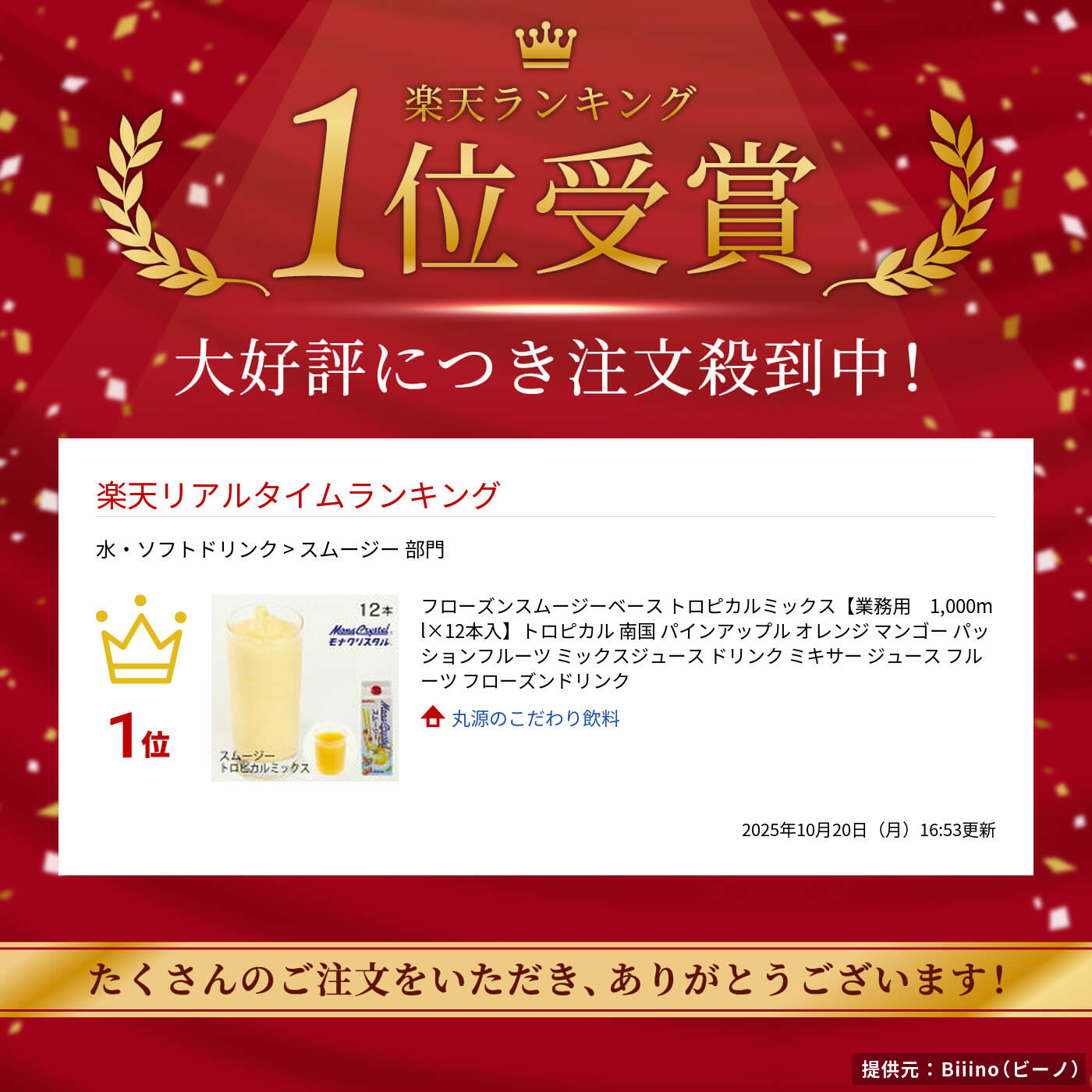 詳細 商品名 モナクリスタル フローズンスムージーベース トロピカルミックス 内容量 1000ml×12本 保存方法 直射日光を避けて常温保存 商品ポイント1 いつでも旬の美味しさ 生の果実・野菜の代用を実現。 季節に関係なく旬の美味しさ提供。 商品ポイント2 なめらかで満足感あるテクスチャー 柑橘のパルプなどを超微細化処理した「シトラスファイバー」を使用。 乳製品を使用しなくてもフルーツ感ある自然ななめらかさ、ボディー感を演出。 商品ポイント3 ミキシングするだけの簡単オペレーション。 業務用ミキサーで、本品1:氷1で混ぜ合わせるだけで、絶品スムージー ※氷が砕ける家庭用ミキサーでも使用可能 【おすすめ用途・関連ワード】 飲み物 かき氷 シロップ スムージー 業務用 パック ブレンダー パフェ スイーツ 製菓材料 風味 果汁 食材 朝食 フルーツティー トッピング ソース フラッペ フルーツジュース ジュース ドリンクメニュー ホームパーティー カフェメニュー デザート レシピ お菓子作り レストラン 飲食店 キッチンカー イベント 文化祭 展示会 お祭り カフェ リキュール カクテル 洋酒 パーティ おうちカフェ 出店 誕生日 プチパーティー バースディ ソーダ ラムネ ハロウイン クリスマス イースター バレンタイン 展示会 夏祭り 婦人会 新年会 忘年会フローズンスムージーベース トロピカルミックス業務用1000ml×12本 ※1本で約10人分(200ml/杯相当)バラ販売もございます。画像をクリック↑こだわり簡単オペレーション使い方いろいろ♪レシピの紹介乳酸発酵シロップとの相性抜群!豊富なラインナップ他のラインナップはこちら↑↑
