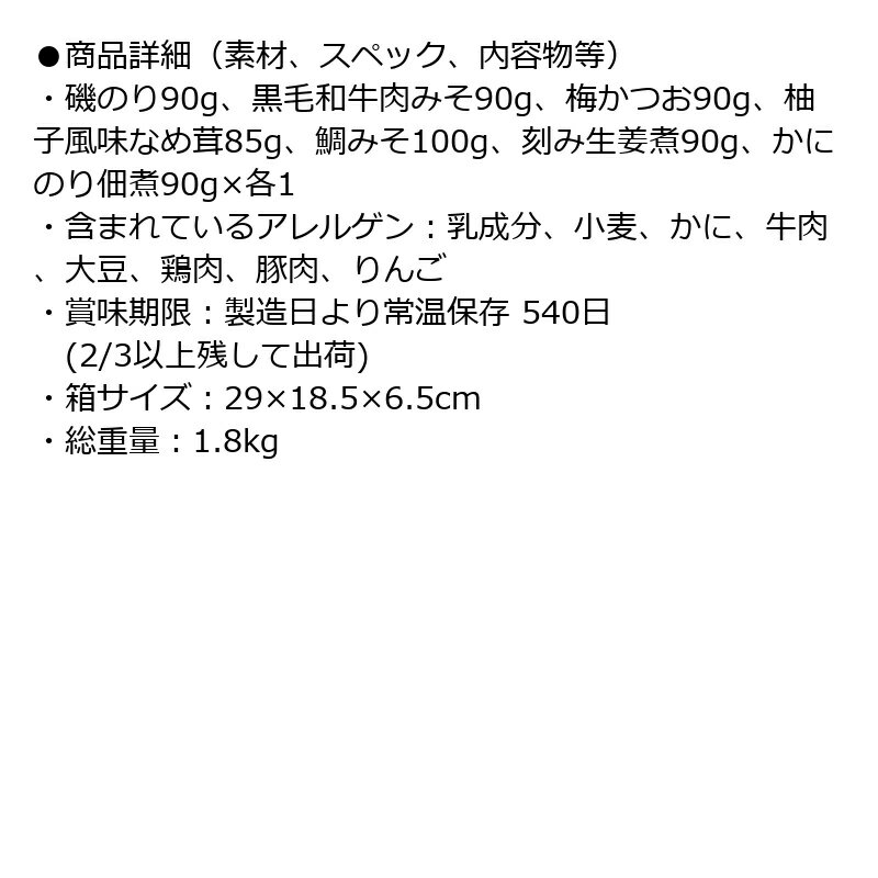 ◆商品名◆ 磯じまん ご飯のお供瓶詰セット ●商品の特徴 四季折々の海の幸、山の幸を風味豊かな佃煮にして、高級感あふれるデザインに仕上げました。 ●商品詳細(素材、スペック、内容物等) ・磯のり90g、黒毛和牛肉みそ90g、梅かつお90g、柚子風味なめ茸85g、鯛みそ100g、刻み生姜煮90g、かにのり佃煮90g×各1 ・含まれているアレルゲン:乳成分、小麦、かに、牛肉、大豆、鶏肉、豚肉、りんご ・賞味期限:製造日より常温保存 540日 (2/3以上残して出荷) ・箱サイズ:29×18.5×6.5cm ・総重量:1.8kg ----------------------------------- 【お歳暮 専用商品】 こちらの商品は「お歳暮 専用」となっております。 それ以外のご用途にはご購入できません。 【注意事項】 ※)遠隔地、離島など一部お届けができない地域がございます。お届け先が発送不可地域の場合、ご案内後キャンセルとさせていただきます。ご了承ください。 ※)相手様行き専用商品で簡易包装、メーカーもしくは産地の形式でのお届けとなり熨斗下お名前はお入れできません。送り状のお名前がご注文者様になります。紙袋、メッセージカードも同梱できません。 ※)産直品以外はご注文からお届けまで約7~10日程度いただいております。ご注文確認後、出荷予定日をお知らせいたします。 ※)期間限定商品につき、お支払いのタイミングによってはご注文をキャンセルとさせていただく場合がございます。 ※)こちらの商品は共通在庫となるため、商品のご用意ができない場合がございます。予めご了承ください。 【発送方法】 こちらの商品は、宅配便でのお届けとなります。 ------------------------------------------------------------------------ 一年の感謝を伝える冬の贈り物に選ばれている、お歳暮ギフト。 上品で高級感のあるお歳暮は、ご家族やご親戚、上司や取引先など、幅広い方に喜ばれる定番の贈り物です。 お世話になった方へのご挨拶や、年末のご縁をつなぐ贈答品として、多くの方に選ばれています。 シンプルながらもおしゃれな印象を与えるお歳暮ギフトは、フォーマルなシーンにもカジュアルな贈り物にも対応。 上司や取引先などのビジネス用途から、ご家族やご友人へのプレゼントまで、さまざまなシーンで活躍します。 落ち着いた雰囲気と上品な佇まいで、贈る方の心遣いをさりげなく伝える冬の定番ギフトです。 年末のご挨拶や感謝の気持ちを届けたい方にぴったりの、お歳暮プレゼント。 おしゃれで高品質な贈り物を探している方にもおすすめです。 相手を思いやる気持ちを形にできる、季節感のあるお歳暮ギフトをぜひお選びください。 ------------------------------------------------------------------------ ◆様々なシーンでご活用できるギフトを取り揃えています◆ 御祝 お祝い 御祝い 慶事 内祝い お返し ご挨拶 結婚祝い 出産祝い 男の子 女の子 快気祝い 全快祝い 長寿祝い 就職祝い 昇進祝い 新築祝い 退職祝い 還暦祝い 成人祝い 卒業祝い 卒園祝い 入学祝い 入園祝い 進学祝い お誕生日 誕生日 バースデー 母の日 父の日 敬老の日 還暦祝い 古希祝い 喜寿祝い 傘寿祝い 米寿祝い 卒寿祝い 白寿祝い 長寿祝い 記念日 結婚記念日 お見舞い 御見舞い 返礼 御礼 お礼 お返し 返礼ギフト 出産内祝い 結婚内祝い 引出物 引き出物 結婚引き出物 寿 ブライダルギフト 成人内祝い 快気内祝い 入園内祝い 入学内祝い 進学内祝い 新築内祝い お節句(ひな祭り) 初節句 七五三 香典返し 法要 法事 弔事 四十九日 百箇日 初盆 一回忌 三回忌 七回忌 回忌法要 お供え 御供え 法事引出物 お供え 志 粗供養 仏事 ご挨拶 御挨拶 粗品 御中元 お中元 御中元 お歳暮 御歳暮 お年賀 御年賀 暑中見舞い 残暑見舞い 記念品 卒業記念品 定年退職記念品 景品 賞品 二次会 ゴルフコンペ 社内行事 引っ越し ギフト プレゼント 贈答品 贈答用 贈り物 ギフトセット 熨斗無料 ラッピング無料 メッセージカード無料 おすすめギフト おしゃれ 人気 マナー ギフトならマルハートにおまかせ! ◆出産内祝い・結婚内祝いに お祝いのお返しとして使いやすい上品なギフトです。 ご家族・ご友人・職場の方など、さまざまな相手に渡しやすく、感謝の気持ちを丁寧に伝えたい場面に適しています。 ◆お歳暮・冬ギフト・季節のご挨拶に 年末年始のご挨拶や、季節の贈り物としても利用しやすいギフトです。 ご家庭用にもビジネスシーンにも自然になじみ、気持ちをそっと届けたいときに活用できます。 ◆誕生日プレゼント・ちょっとしたお礼として 誕生日のお祝いはもちろん、日頃のお礼やご挨拶にも使えるギフトです。 友人・家族・同僚など、相手を問わず贈りやすい落ち着いた雰囲気で、幅広いシーンに合わせやすい内容になっています。 ◆結婚祝い・新築祝い・引き出物に 人生の節目を祝う贈り物としても利用しやすいギフトです。 結婚祝い・新築祝い・引き出物など、フォーマルな場面にも合わせやすく、心を込めた贈り物としてご利用いただけます。◆商品名◆ 磯じまん ご飯のお供瓶詰セット ●商品の特徴 