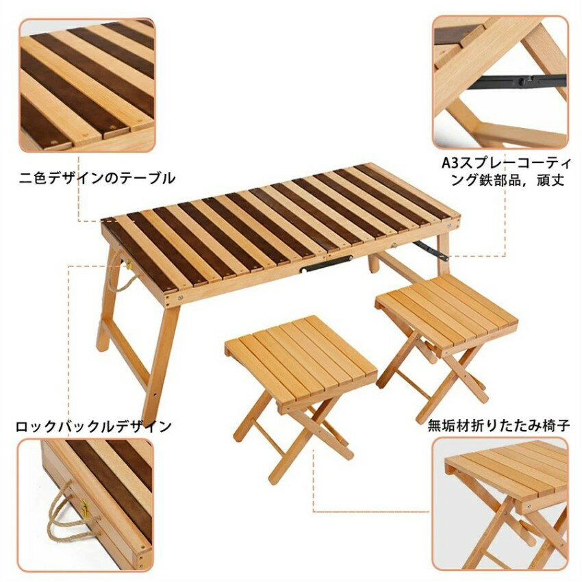アウトドア テーブルセット3点セットアウトドア テーブル チェア 折りたたみ レジャーテーブル 無垢材 キャンプ テーブルセット バーベキュー テーブル 椅子 セット 持ち運び便利 テーブル1点&チェア2点セット キャンプ お花見