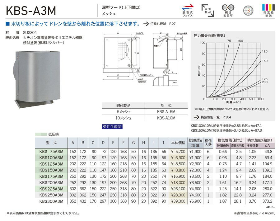 材質:SUS304表面処理:カチオン電着塗装後ポリエステル樹脂焼付塗装(標準Uシルバー)特長:ドレン対策(流下タイプ)水切り板によってドレンを壁から離れた位置に落下させます。【換気性能】排気 圧損係数:1.87排気 直管相当長:28.1給気 圧損係数:3.7給気 αA:373.2