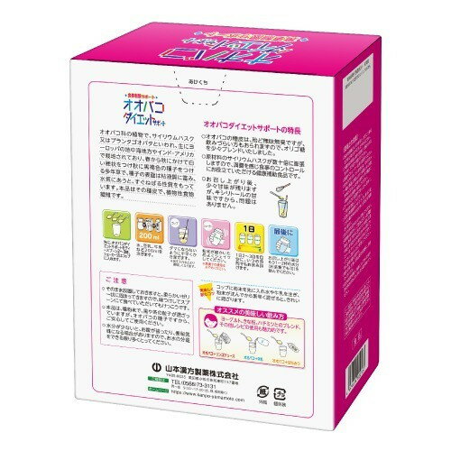 広告文責・販売事業者名:株式会社ビューティーサイエンス TEL 050-5536-7827商品名 山本漢方製薬 オオバコダイエット 450g 内容量 450g 原材料 プランタゴオバタ種皮(種皮純度98%以上)(インド)、ビートオリゴ糖、てんさい糖/甘味料(キシリトール)、香料 栄養成分 5gあたり エネルギー:9kcal、たんぱく質:0.4g、脂質:0.02g、炭水化物:4.7g(糖質:2.5g、食物繊維:2.2g、食塩相当量:0.04g オリゴ糖:50mg お召し上がり方 ・先に、オオバコダイエットサポートをティースプーン2~3杯、シェーカー又はコップに入れます。 ・水、豆乳、牛乳など200mlを注ぎます。 ・ダマにならないように手早くかき混ぜます。氷を入れるとよりおいしくなります・粉末が細かいためよくシェイクしてください。熱湯での使用はおやめください。 ・1日2~3回を目安に、いつの時間でもお飲みいただけます。 ・お召し上がり後はもう1~2杯の水分(お茶類でも可)を飲んでください。 注意事項 ・直射日光及び、高温多湿の場所を避けて、保存してください。 ・そのまま放置しておきますと、柔らかいゼリー状に固まってきますので、あじつけしてスプーンにて食べていただいてもけっこうです。 ・本品は、粗粉末で、黒や茶の粒子が混ざっていますが、オオバコの種子ですから、安心してご使用ください。 ・水分が少ないと、おなかが張ったり、便秘気味になる場合がありますので、お水の分量をできる限り多くとってください。 備考 ※効果には個人差があります。 すべての方に効果を保証するものではありません。 ※パッケージデザイン等は予告なく変更されることがあります。 ※メーカー都合により商品のリニューアル・変更及び原産国の変更がある場合があります。 区分 健康食品 製造国・原産国 日本 発売元・販売元 山本漢方製薬 JANコード 4979654022163