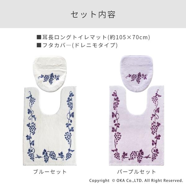 商品詳細 アイテム: トイレマット ロングサイズ サイズ : 約75cm×63cm(マットの高さ 約15mm) 素 材 : アクリル100%(特殊吸水素材・抗菌防臭加工) 裏面すべり止め加工 備 考 : 日本製 アイテム: フタカバー(ドレニモタイプ) 素 材 : アクリル100%(特殊吸水素材・抗菌防臭加工) 吸着シート:アクリル樹脂 備 考 : 日本製 ご注意 飛び乗ったりすると、すべってけがをすることがあります。 洗濯所のご注意 ●乾燥機がご使用にならないでください。(熱により変形・損傷の恐れがあります。) ●柔軟剤や漂白剤は、ご使用にならないでください。 ●家庭用洗剤をご使用の上、洗濯機での丸洗いは洗濯ネットをご使用ください。 ●初めは多少毛羽が出ますので、他のものとは別にしてください。 ●ねじり絞りは避け、陰干ししてください。 ●損傷を防ぐ為、洗濯槽の高さより低くなるように折りたたんで単品で洗濯してください。 ●この製品に使用しているゴムは直射日光に弱い性質がありますので、陰干ししてください。 ●他の物に色移りする場合がありますので別にしてください。 お願い ●長期間敷き詰めたままにしておくと、マットの裏面剤や床用ワックスの影響で床材が、黄変または密着したり、床が滑りやすくなる場合があります。 ときどき使用場所をずらしたり中性洗剤で床面をふいたりしてご使用ください。 ●マットが湿った状態で長時間放置すると、かびの発生原因となります。 ●パイルを引っぱったり、引っかけたりしないでください。(パイルがほどけた場合は、ハサミでカットしてください) ●フタ表面のホコリや汚れをふき取ってからカバーを装着してください。 ●ご使用中に吸着が弱くなった場合は、固く絞ったタオル等でフタをと吸着シートをふいてください。 ●薬品を使ってお掃除する場合はフタカバーをはずしてください。繊細な柄が表現できるウィルトン織りマットならではのエレガントな「乾度良好🄬ラクス トイレシリーズ」のドレニモフタカバーとロングトイレマットがセットになったトイレ2点セット。 毛立ちがいい、踏み心地がいい、日本製のこだわりのトイレマットです。 お洗濯でき、抗菌防臭加工付きなのでいつでも清潔に保つことができます。 トイレマットの裏面にはすべり止め加工が施されているのでズレにくい。 糸の目をぎゅっと詰めて織り上げ、触り心地、重さなどに高級感があり、葡萄のデザインがトイレの空間をエレガントに彩ってくれます。 フタカバーはほとんどの機種に適合できるよう吸着で貼りつけるタイプとなっています。 ▼ 各アイテムの詳細ページはこちら ■ レギュラー トイレマット の詳細ページはこちら ■ ロングサイズ トイレマット の詳細ページはこちら ■ 耳長ロングサイズ トイレマット の詳細ページはこちら ■ 洗浄暖房・普通型兼用ドレニモタイプフタカバー の詳細ページはこちら ■ トイレットペーパーホルダーカバー の詳細ページはこちら ■ 洗えるスリッパ の詳細ページはこちら ■ バスマット約45×60cm の詳細ページはこちら ■ バスマット約50×80cm の詳細ページはこちら ■ バスマット約70×100cm の詳細ページはこちら