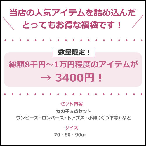 ・・・・・・・・ Comment! ・・・・・・・・ 【商品説明】 大人気の今すぐ使える春夏コーデがぎゅっと詰まった"おめかし福袋"が登場しました。 普段着とはちがう、 ちょっとしたお出かけや特別なシーンに ぴったりのお洋服を厳選しました! 個別に選ぶと、高くなっちゃう、ちょっとしたお出かけ着や映えコーデも、この「おめかし福袋!」でお得に叶えちゃいます! 【サイズ】 70/80/90cm) 【内容】 トップス・ワンピース・ロンパース・靴下・ファッション小物など、5点入り (※数量限定商品となります。) ・・・・・・・・ ご購入前に必ずお読みください ・・・・・・・・ 【ご購入前に必ずお読みください】 ※ 色・デザイン・ブランドのご希望は、お受けできかねますのでご了承ください。 ※ ご奉仕品の為、返品・交換はお受けできかねますのでご了承ください。 ※ 複数ご購入頂いた場合、同じセット内容の場合がございます。 ※ 福袋につきましては、ギフトラッピングには対応しておりません。 ※ 数量限定のため、在庫が無くなり次第終了となります。 ※ タグが海外サイズの表記となっている場合、標準的な日本サイズに合わせてお入れさせて 頂いております。 ・・・・・・・・ 配送方法 ・・・・・・・・ 配送方法はメール便・定形外郵便のみとさせていただきます。 ※メール便配送の場合、日時指定・速達配送・お箱のラッピングが行えません。