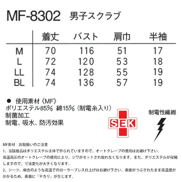 ●制菌加工●制菌加工制電、吸水、防汚効果●手術下着に必要な条件は、体の動きが楽なこと、汗の吸収のよい素材であること。伸縮性のあるニットはその条件を満たしてくれます。肌側には着心地よい綿がくるように設計。運動機能を持たせた袖構造。すばやく簡単に着脱でき、あまり胸元が開きすぎないシンプルなデザインです。●極めて高い伸縮性能により、運動機能をサポートするとともに、快適な着用感を提供します。特殊仕上により吸水、防汚効果を付加しています。業務用洗濯にも耐えうる形態安定素材です。●男性用●ポリエステル85%綿15%(制電糸入り)国内シェアNo.1 ナガイレーベンの白衣