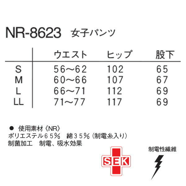 ●制菌加工●制菌加工制電、吸水効果●ウエスト総ゴムのゆったりシルエットのパンツです。裾巾は動きやすく、やや狭くなっています。●しっかりとした綾組織で張り腰があり、安定感のある素材です。綿35%により吸汗性があります。●女性用●ポリエステル65%綿35%(制電糸入り)国内シェアNo.1 ナガイレーベンの白衣