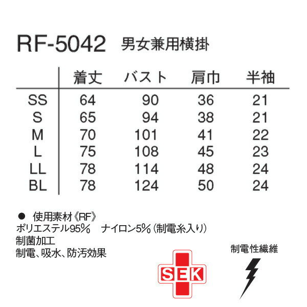 ●制菌加工●制菌加工制電、吸水、防汚効果●より動きを要する日常業務において、動きやすいストレッチ性と涼感機能を持った素材を活用し、ポロシャツ感覚で着用できる専門性の高いケーシータイプのデザインです。ベースカラーの濃色は患者さんにとって標識性を高めると共に、温もりのある環境色にとても馴染むカラーリングです。●生地に触れたときにひんやりする、接触冷感素材です。高い伸縮性を持ち、着心地の良さと動きやすさを提供します。特殊仕上により吸水、防汚効果を付加しています。業務用洗濯にも耐えうる形態安定素材です。●男女兼用●ポリエステル95%ナイロン5%(制電糸入り)国内シェアNo.1 ナガイレーベンの白衣