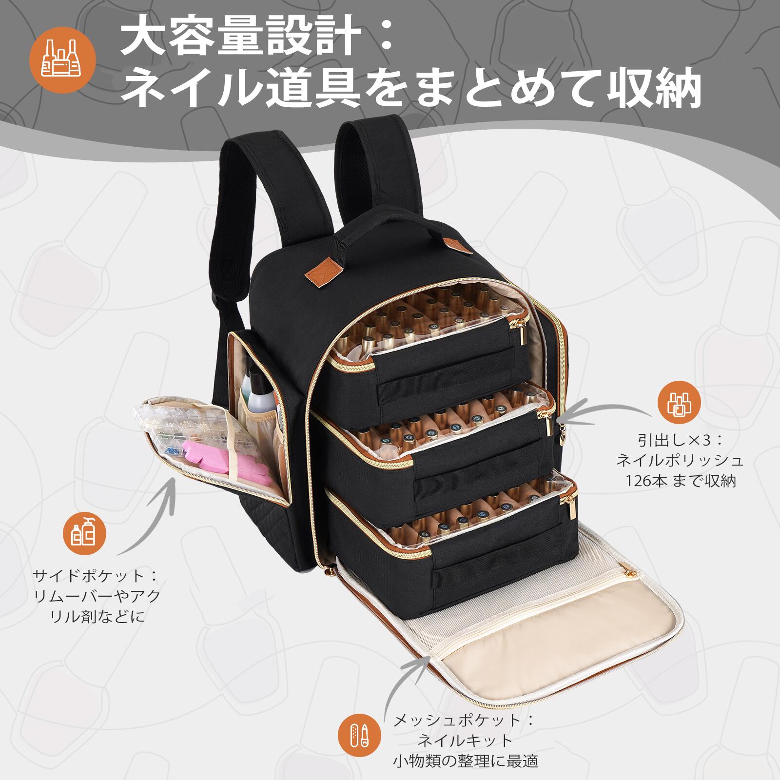 プロの道具に、プロの収納を126本のネイルポリッシュからランプ、道具まで全てをまとめて。移動式サロンのネイリストから、自宅にコレクションが増えた方まで、これひとつで完璧に整理と移動ができます。圧倒的大容量!3段引き出し式各引き出しにネイルポリッシュを42本、合計126本まで収納可能。引き出しは単体で取り出せるので、1つを自宅用に、残りを移動用に分けるなど、柔軟な使い分けができます。プロも満足の機能的な収納スペース大型ポケットには、LED/UVネイルランプ、ネイルブラシ、ニッパー、ファイルなど、多種多様なネイルツールを整理して収納。すべてが一目で分かり、すぐに取り出せます。シーンに合わせた3WAY携帯1.上部の携帯ハンドルで手軽に。 2.背面の2本ショルダーストラップで肩にかけて楽々。 3.背面の大きなストラップでスーツケースに固定。 どんな移動手段にも最適です。ポリッシュを守るクッション性と仕切り高密度のソフトスポンジ素材が、移動中の衝撃や振動から瓶を保護。内部の仕切りが一瓶一瓶をしっかり固定し、衝突やガチャつき音を防止します。多様な使用シーンプロのネイリストさんによる移動サロンに。 自宅で楽しむ方の道具の整理に。 ネイルが大好きな方への、実用的で喜ばれる贈り物に。注意事項・当店の商品は全て国内から配送されます。 ・国内配送の商品は国内でのお買い物と同じく消費税が発生いたします。関税はかかりません。 *商品の撮影には最大限注意を払っておりますが、閲覧時のモニター環境によりましては実際の商品と若干違うお色味に映ることもございます。