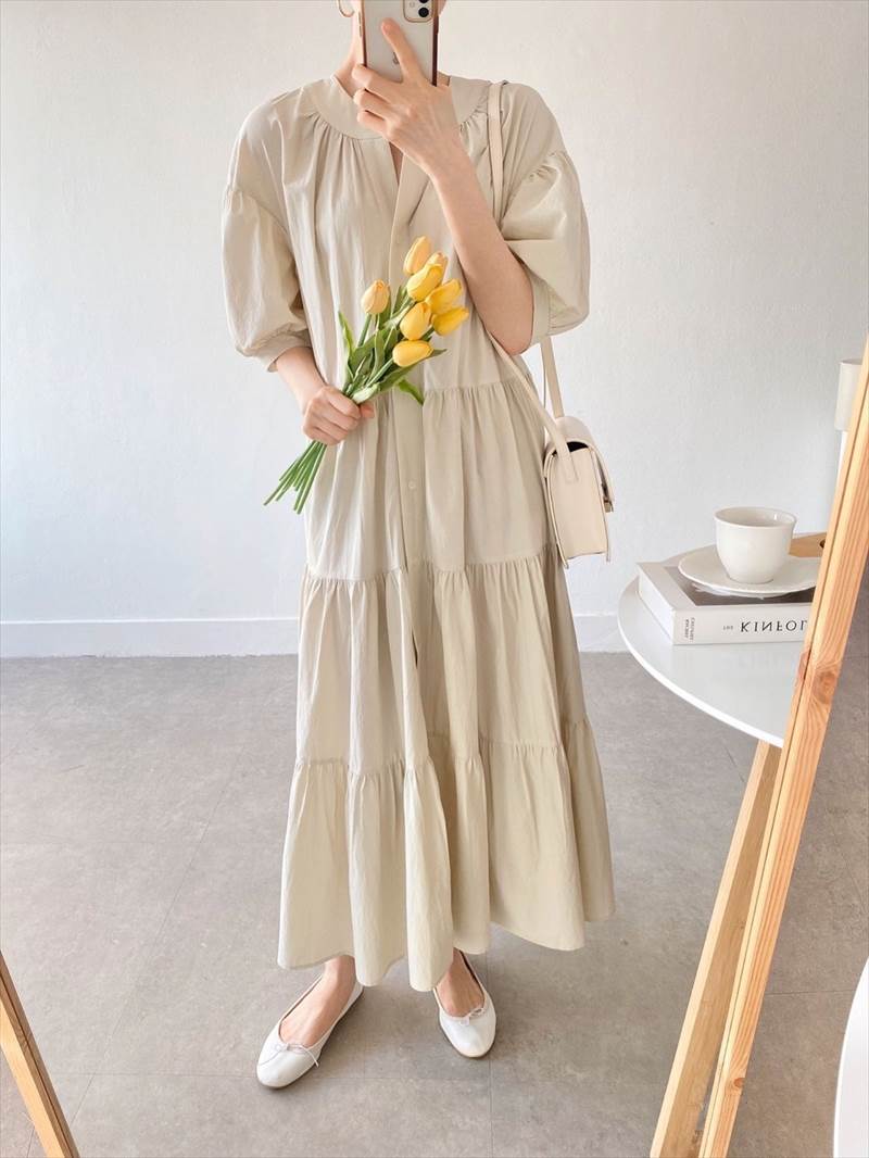 【P2倍&クーポン有】ティアード ボリューム袖 ドロップショルダー ラウンドネック レディース シャツワンピース ティアードワンピ 個性的 春 夏 秋 ロング丈 アンクル丈 お尻カバー ポッコリお腹カバー 五分袖 フレア 前開き 落ち感 すっきり 立体的 ハリ感
