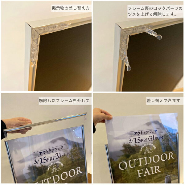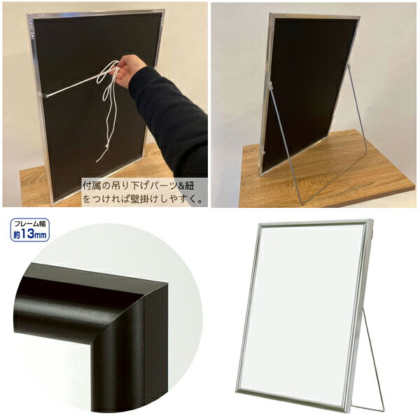 商品の仕様●スタンド付きパネル A2シルバー●素材:フレーム/アルミ17mm厚●前面カバー:PET樹脂0.6mm厚●中敷:ダンボール1.5mm厚●裏板:ダンボール3mm厚●サイズ:スタンド使用時/A2:幅42.5×奥行24×高さ58cm●吊り金具・吊りひも付き 1mm厚までのポスターをご使用いただけます。屋内専用です。●※スタンドパーツの取り外しはできません。●スタンド付きで卓上やフロアに置いてご利用いただけます。 スタンド部分をたたむと壁掛けも可能です。※商品画像はイメージです。複数掲載写真も、商品は単品販売です。予めご了承下さい。※商品の外観写真は、製造時期により、実物とは細部が異なる場合がございます。予めご了承下さい。※色違い、寸法違いなども商品画像には含まれている事がございますが、全て別売です。ご購入の際は、必ず商品名及び商品の仕様内容をご確認下さい。※原則弊社では、お客様都合(※色違い、寸法違い、イメージ違い等)での返品交換はお断りしております。ご注文の際は、予めご了承下さい。