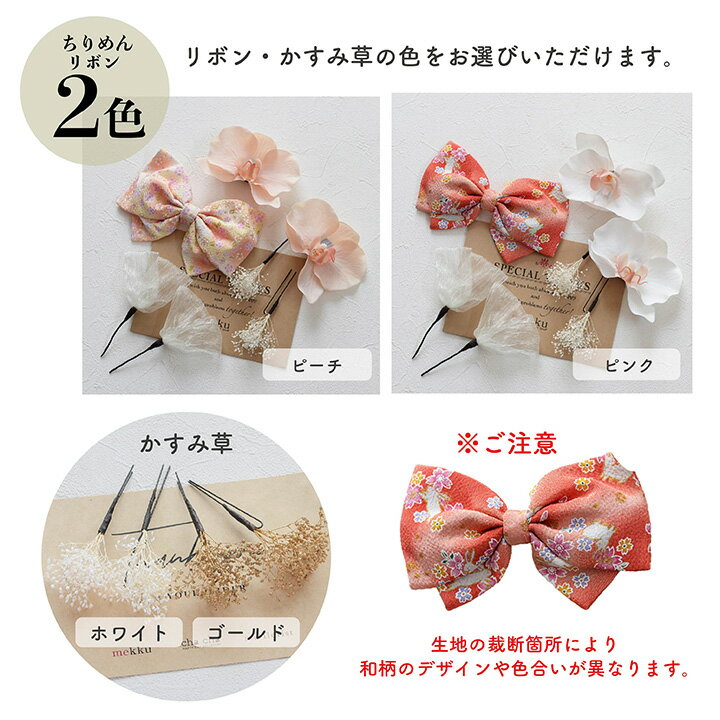 サイズ 幅ちりめんリボン 幅15cm 胡蝶蘭 10cm かすみ草 4cm ※ハンドメイド品の為、多少前後します素材ちりめん/レーヨン かすみ草/プリザーブドフラワー リボン/オーガンジー 合金(ピン部分等)納期在庫のある商品は1~2営業日で発送予定です。 (※あす楽対応・即納 商品も土日祝は発送業務お休みです) お急ぎの場合は別途ご連絡下さい。注意事項・PC環境で若干お色目が異なる場合がござます。 ・1点1点手作りの為仕上がりに個体差がございます。 ・直射日光に長時間当てないでください。色あせの原因となります。【即納】七五三 髪飾り ちりめん 和柄リボン かすみ草 オーガンジー【2色】ピーチ・ピンク[kd042]// 7歳・ハーフ成人式におすすめ //大きなちりめんリボンが可愛い、七五三のお子様用の髪飾りです。アンティークな雰囲気がレトロでおしゃれ!かすみ草は2色(ホワイト・ゴールド)からお選びいただけます。お着物に合わせた組み合わせをお楽しみください。1点1点丁寧にお作りしているハンドメイドの商品ですので、大切なお子さんやお孫さんへの贈り物にもおすすめです。ハレの髪飾りの後は、浴衣や卒業式などにも大活躍します。モデル年齢/7歳 身長123cm