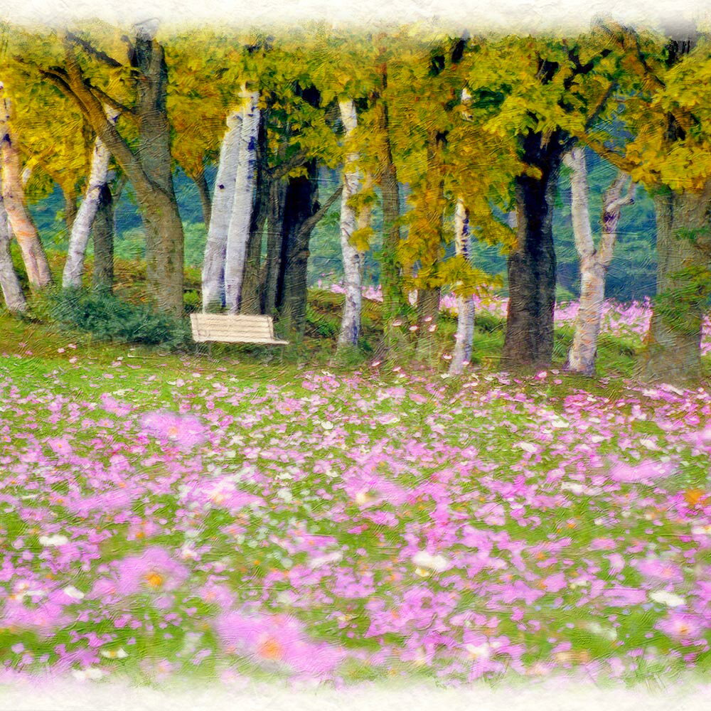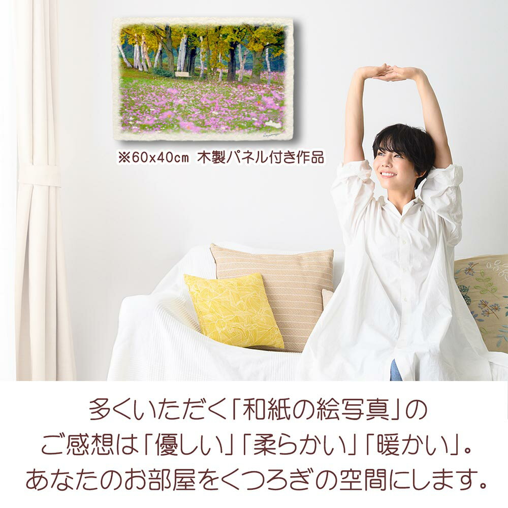 絵 風水 絵画 玄関 おすすめ 運気が上がる絵 インテリア アートパネル 風景画 おしゃれ 開運 金運 トイレ 玄関 に 飾る 絵 画 壁掛け 花 木 森 秋 花の絵 和紙の絵写真 「コスモス畑と白樺林のベンチ」