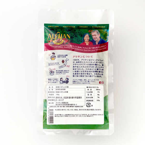 アリサン 有機かぼちゃの種は、亜鉛を多く含み、栄養価の高いナッツのひとつ。 お料理にはもちろん、炒ってビールやお酒のおつまみにも。 無塩タイプ。 ローストしていません。 <アリサンについて> アリサン有限会社が海外からナチュラルフードを日本に紹介し始めたのは1988年。 もともと自分達が食べるためのグラノラやピーナッツバターを輸入し始めたことが日本に住む友人たちに知れ渡り、現在の形へと発展してきました。 社名の『アリサン 』は代表のパートナー、フェイの故郷である台湾の山『阿里山』からきています。 阿里山は標高が高く、厳しい自然環境にあるのですが、大変美しいところです。 また、そこに住む人々は歴史や自然への造詣が深く、よく働き、暖かい。そして皆が助け合って暮らしています。 自分達が愛するこの強くて優しい阿里山のような場所を作りたいとの思いから社名を『アリサン 』と名付けました。 現在の取り扱い品目は約300種類。 日常的にご使用いただけるオーガニック&ベジタリアンフードを基本としています。 また、食生活の幅を広げ、より楽しめるために、日本では馴染みのない“エスニックフード”も多数あります。 ■商品名:アリサン 有機かぼちゃの種 100g かぼちゃの種 食用 オーガニック 亜鉛 有機 野菜 野菜の種 送料無料 ■内容量:100g×2 ■原材料名:有機かぼちゃの種 ■アレルギー表示:本品製造工場では、小麦を含む製品を製造しております。 ■メーカー或いは販売者:アリサン ■賞味期限:6ヶ月 ■保存方法:開封後は密閉し冷暗所保管。なるべくお早めにお使い下さい。 ■区分:食品 有機JAS ■製造国:オーストリア ■認定団体:LACON ■特徴:乳製品不使用、ベジタリアン ■成分情報: 目安量:100g 熱量:582kcal たんぱく質:37g 脂質:46g 炭水化物:7.6g 食塩相当量:0.03g【免責事項】 ※記載の賞味期限は製造日からの日数です。実際の期日についてはお問い合わせください。 ※自社サイトと在庫を共有しているためタイミングによっては欠品、お取り寄せ、キャンセルとなる場合がございます。 ※商品リニューアル等により、パッケージや商品内容がお届け商品と一部異なる場合がございます。 ※メール便はポスト投函です。代引きはご利用できません。厚み制限(3cm以下)があるため簡易包装となります。 外装ダメージについては免責とさせていただきます。