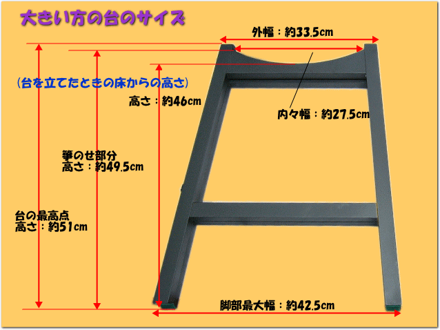 ●台の素材:合板 ●色:黒塗 ●サイズ・・・詳細画像をご参照ください。 ●重量:1組=約2Kg ●専用ケース付 ※ご注文前にサイズを良くご確認下さい。サイズが合わないなどのキャンセルは受付致しかねます。予めご了承ください。※詳細サイズはそれぞれの画像をクリックすると大きな画像でご覧いただけます。 総合楽器メーカーの全音のお箏用脚立式立奏台です。 標準的な13弦箏また新福山箏を載せることが出来ます。 合板黒塗り仕上げで落ち着いた色です。 専用のケースも付属しておりますので、持ち運びに便利。 2つの台、それぞれのサイズに関しましては詳細画像をクリックして頂ければ、詳しいサイズの画像をご覧いただけます。 特徴 台座部分が湾曲型になっておりますので、箏を台の上部内側端の4点で支え安定感がございます。 箏は年数が経過するにつれて裏板が変形してくる場合がございますので、その様なお箏を載せるのにもお勧めの台です。