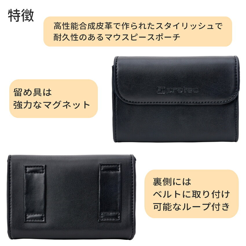 PROTEC(プロテック) 管楽器用マウスピースポーチ プロ、アマチュア問わず数多くのアーティストに愛用されてきたプロテック。スタイリッシュなデザインと、抜群の強度、収納性能の高さが特長です。 素材やデザインの展開が豊富なため、マウスピースの保護だけでなく、用途に合わせてお好みのポーチをお選びいただけます。 マウスピースを複数お持ちの方や、楽器本体は学校や施設/楽団等の備品を使用し、マウスピースだけ自分のもので演奏されるという方など、マウスピースだけを持ち運びたい方にもオススメの商品です。 ■A272(ブラック) ・マウスピースポーチ ・トロンボーン、アルトサックス、クラリネット用 ・3本収納可能 ・素材:高性能合成皮革 ・留め具:強力なマグネット ・豪華なベルボア裏地 ・ベルト/ストラップ ループ付き ※モニタによりお色が異なって見える場合がございます。思っていたものと異なる等でのご返品は受け付け致しておりません。 ※購入前に対応楽器をよくご確認下さい。ご購入後に、サイズが合わない等のでのキャンセルは出来ません。 ※画像内のマウスピース本体は付属しておりません。予めご了承下さい。PROTEC(プロテック) プロ、アマチュア問わず数多くのアーティストに愛用されてきたプロテック。スタイリッシュなデザインと、抜群の強度、収納性能の高さが特長です。 素材やデザインの展開が豊富なため、マウスピースの保護だけでなく、用途に合わせてお好みのポーチをお選びいただけます。 マウスピースを複数お持ちの方や、楽器本体は学校や施設/楽団等の備品を使用し、マウスピースだけ自分のもので演奏されるという方など、マウスピースだけを持ち運びたい方にもオススメの商品です。 ■A272(ブラック) ・マウスピースポーチ ・トロンボーン、アルトサックス、クラリネット用 ・3本収納可能 ・素材:高性能合成皮革 ・留め具:強力なマグネット ・豪華なベルボア裏地 ・ベルト/ストラップ ループ付き ※モニタによりお色が異なって見える場合がございます。思っていたものと異なる等でのご返品は受け付け致しておりません。 ※購入前に対応楽器をよくご確認下さい。ご購入後に、サイズが合わない等のでのキャンセルは出来ません。 ※画像内のマウスピース本体は付属しておりません。予めご了承下さい。