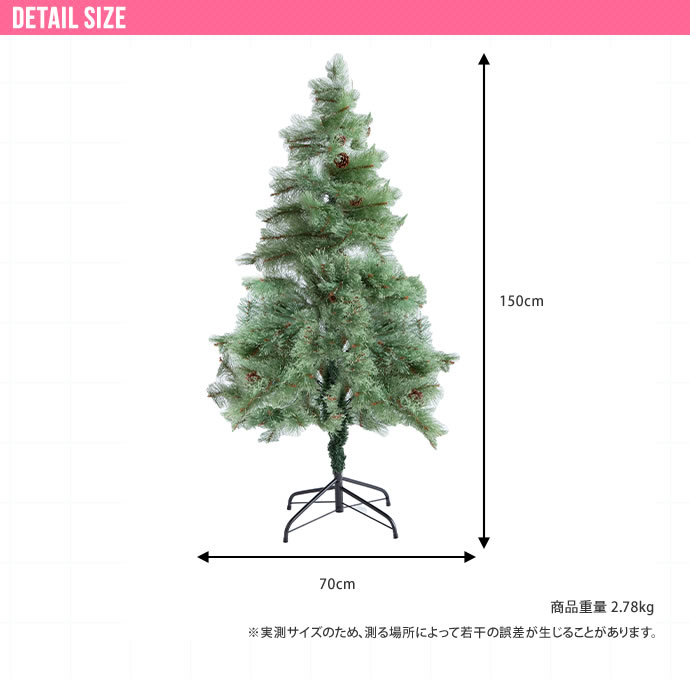 商品スペック一覧 生産地 中国 サイズ 幅70cm×高さ150cm 素材 PVC・スチール 重量・注意事項 【組立品】 【商品重量】約2.78kg 【付属品】 ・松ぼっくり26個 ・LEDライト1セット(電球の数:120個) ・脚カバー1セット ※単三乾電池を3本ご用意ください。 ※組み立て時間:1人で約15分(飾り付け時間除く) ※組み立て工具は不要 梱包サイズ 【梱包サイズ】90cm×25cm×29cm 【梱包重量】約4.36kg 仕様の注意事項 商品の仕様やデザインは、品質に問題がない程度に予告なく変更させていただく場合がございます 商品の仕様やデザインは随時改善をしており、入荷のタイミングによってはデザインが変更されている場合がございます。 何度も同じ商品をご注文しているお客様はくれぐれもご注意下さい。 部品、生産国、脚部の形状、縫製、カバー類の色や形、サイズなどに少々誤差が発生する場合がございます。 予めご了承を宜しくお願い致します。 ※在庫状況や返品、キャンセル等について こちらの商品はメーカー直送商品となります。 ご注文確認後にメーカーへ在庫確認を致しますので、 ご注文後に在庫がない場合がございます。その際は何卒ご了承下さい。 また、メーカー特注品の為、ご購入後のキャンセルや返品、交換、変更等は お受け出来かねます。予めご了承下さい。 ※お支払い方法・配送について 北海道・沖縄・離島については、配送不可のため当店により ご注文をキャンセルとさせて頂きます。何卒ご理解お願い致します。 代金引換はご対応不可となります。 ご選択された場合、当店にてご注文キャンセルとさせて頂きますので 何卒ご了承下さい。 ※日時指定について メーカー直送商品の為、日時指定は不可となります。 記載頂きましてもご対応出来かねますので予めご了承下さい。 商品により運送会社が異なります為、確約・確証はございませんが、 発送完了メールに記載のある運送会社及び追跡番号等をご確認頂き、 お客様にて運送会社へご相談下さい。