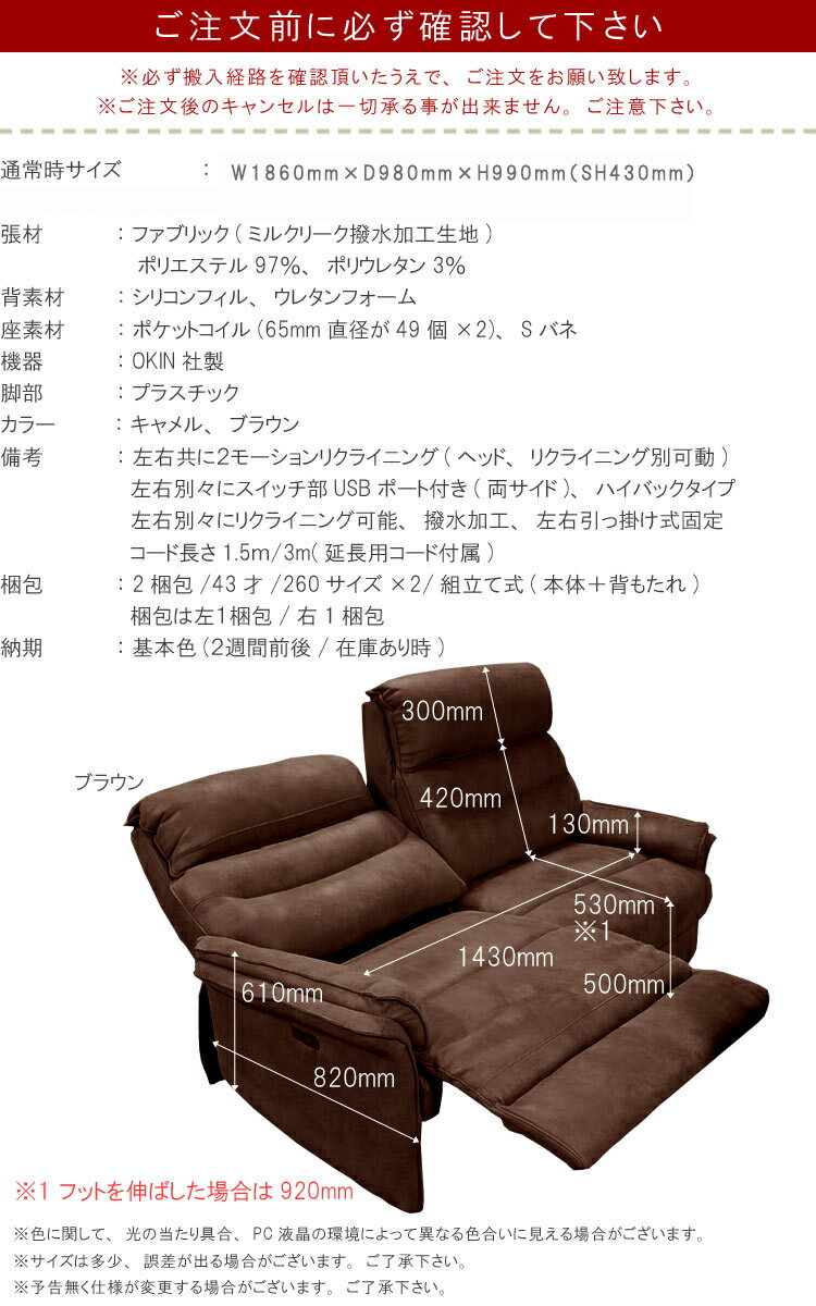 電動ソファ リクライニング 電動 幅186cm USBポート付き 開梱設置配送 撥水加工生地 2モーションソファ ポケットコイル シリコンフィル キャメル ソファー 3人掛け ミッドセンチュリー 北欧 モダン テイスト 高級感 3P sofa 3人掛け SOK QOG-160 p3 革の様な質感